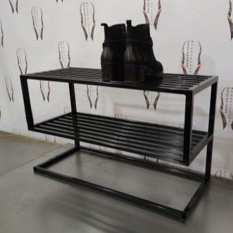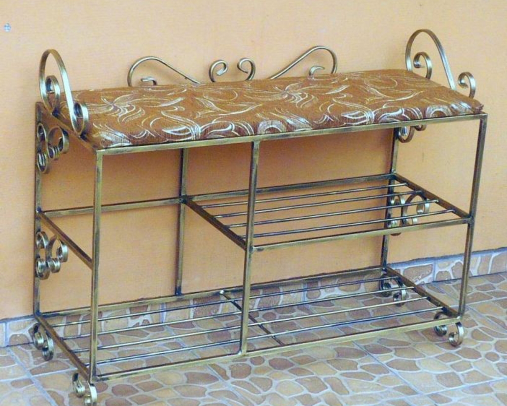 Normalerweise sind Metallgestelle von offener Art. Die Metallregale bestehen aus Gitter und Latten. In diesen Regalen trocknen Schuhe gut. Es werden auch geschmiedete Modelle angeboten, die sich durch ihre Schönheit und ihr ungewöhnliches Aussehen auszeichnen. Metallregale sind aufgrund ihres ungewöhnlichen Aussehens und ihrer Dekorativität sehr beliebt. Eisenkonstruktionen passen gut zu einem minimalistischen Loft oder High-Tech-Interieur.