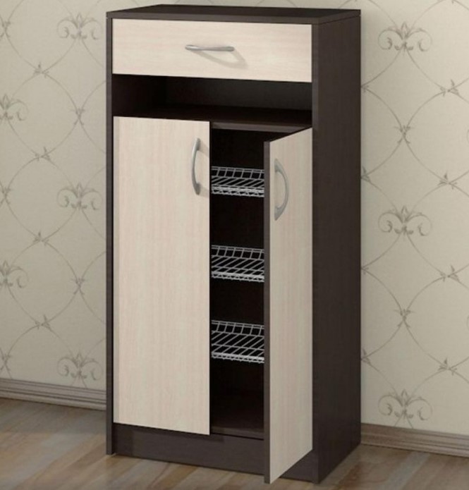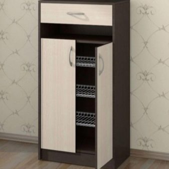 Slim Nachttisch ist ein schmaler Nachttisch, der entweder hoch oder niedrig sein kann. Die Türen lassen sich leicht um 45 Grad klappen. Solche Modelle passen perfekt in das Innere jedes Korridors. Das Minus des Modells ist der begrenzte Innenraum, sodass Sie in diesen Nachttischen nicht so viele Schuhe verstauen können.