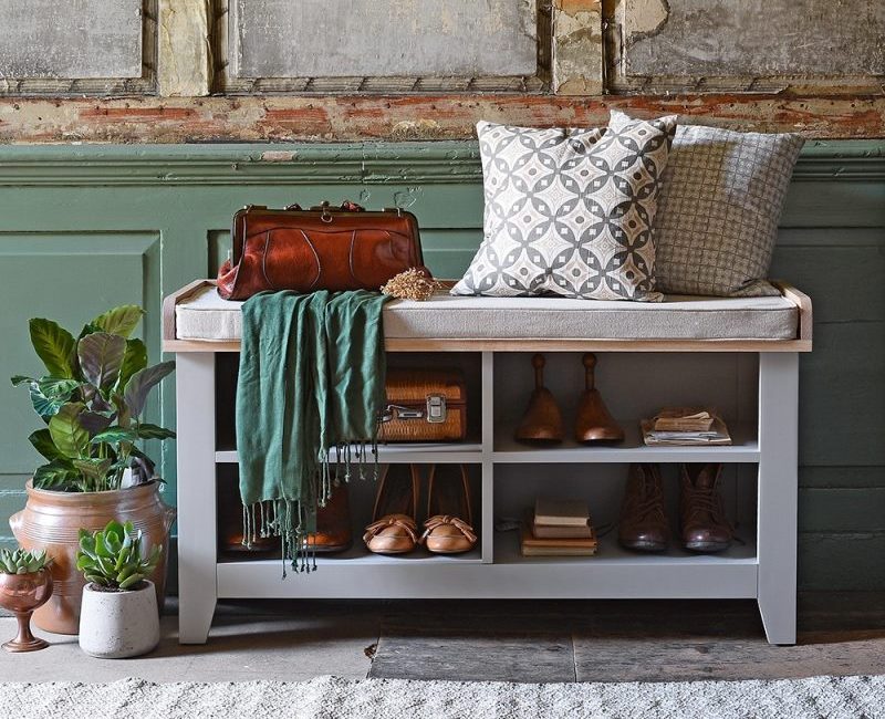 Regale sind eine der funktionalsten Optionen. Sie sind in der Regel nicht sehr hoch und das Oberteil lässt sich leicht zu einer Sitzfläche ausklappen, auf der Sie beim Anziehen der Schuhe sitzen können. Bei einem solchen Regal müssen Sie keine Ottomane oder einen Stuhl installieren, damit der Platz nicht überladen ist.
