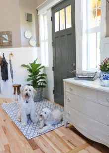 Das erste, was Sie beachten sollten, ist, ein Paar Teppiche zu verwenden, um es so sauber wie möglich zu halten. Einer befindet sich draußen und der andere - direkt am Eingang des Hauses. Eine Außenfußmatte nimmt den größten Teil des Straßenschmutzes und Sandes auf, daher besteht sie normalerweise aus Materialien, die leicht zu reinigen sind. Türteppiche bestehen aus polymeren und natürlichen Materialien mit kurzem Flor, sie nehmen Schmutzrückstände auf. Das doppelte Schmutzschutzsystem hält Ihr Zuhause sauber und ordentlich.