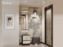 - Der Flur sieht originell aus mit einer Tapetenkombination. Die Wand neben der Haustür wird in einer dunkleren Farbe hervorgehoben. Der Rest der Wände ist perfekt mit ihrem allgemeinen Ton kombiniert, aber die Tapete hat ein Muster in Form einer durchbrochenen Ligatur. Die Farbe des Musters harmoniert mit Böden, Decken und Möbeln. Ein Wandspiegel verleiht dem Flur Leichtigkeit und Luftigkeit.