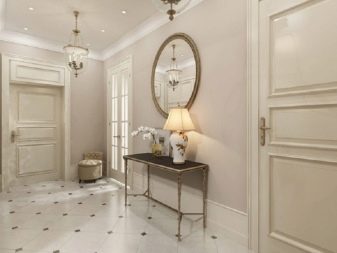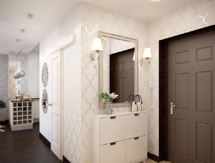 - Kombinationen aus heller und weißer Tapete wird den Flur feierlicher erscheinen lassen. Gleichzeitig ist es ratsam, ein kaum wahrnehmbares Muster für die Leinwand zu wählen, es sollte sich nicht von den Wänden abheben. Große Wandspiegel ergänzen den Raum und sorgen für mehr Volumen.