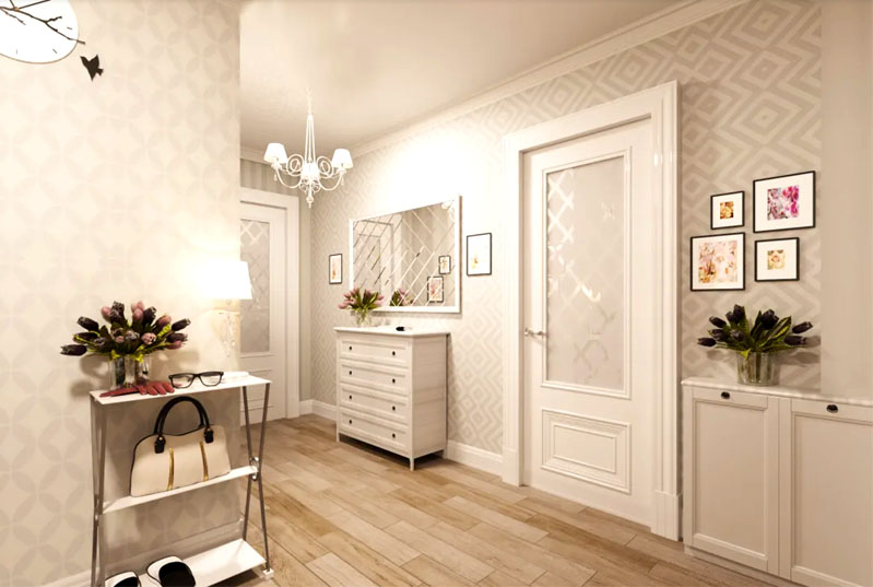 Eine allgemeine Empfehlung vor Arbeitsbeginn kann der Wunsch sein, helle Tapeten im Flur zu verwenden. Dies liegt vor allem daran, dass dieser Teil der Wohnung keine Fenster hat. Ein kleiner Raum, der in hellen Farben dekoriert ist, wird zweifellos attraktiver sein und optisch größer erscheinen.