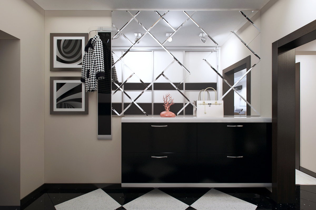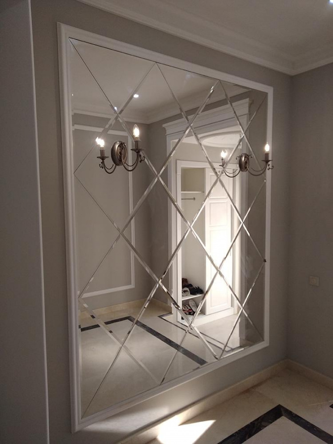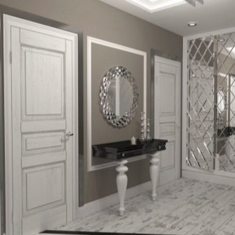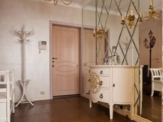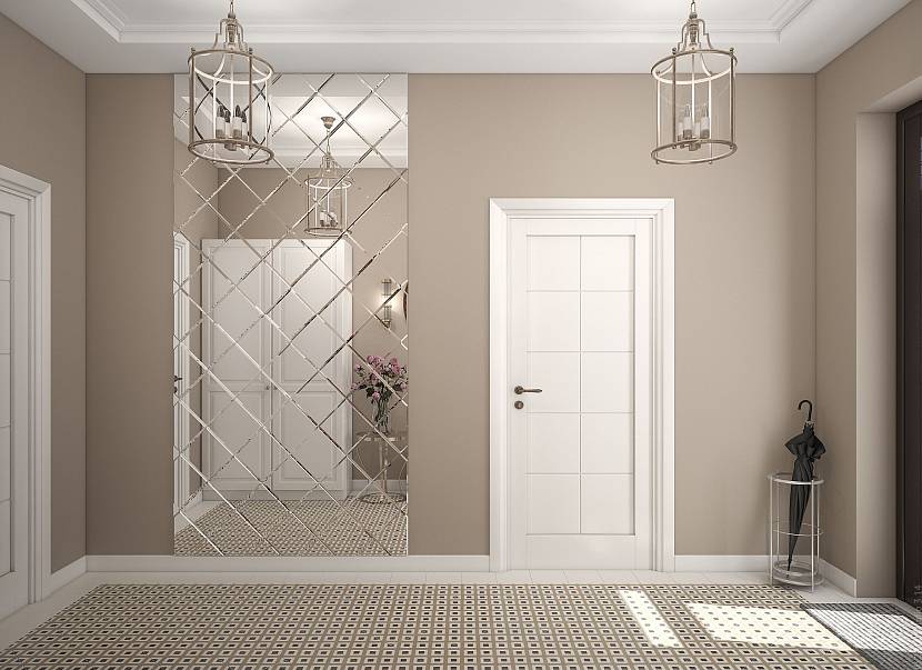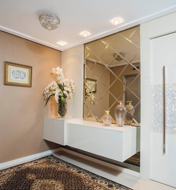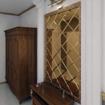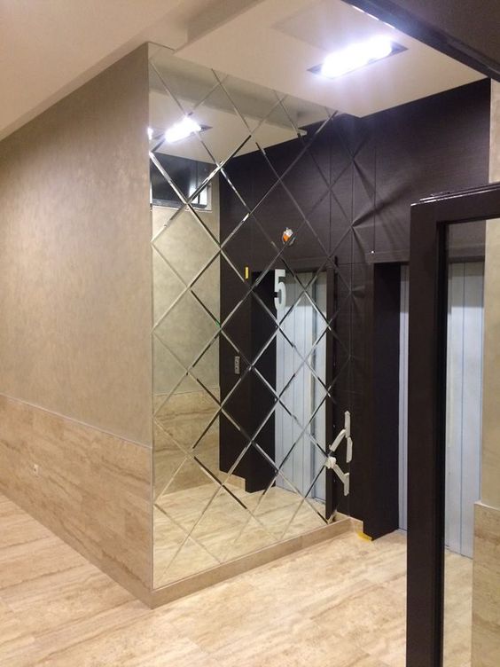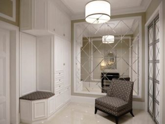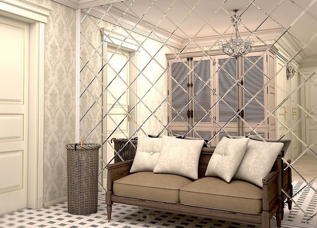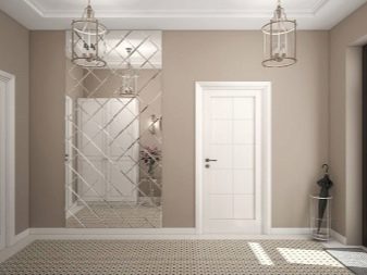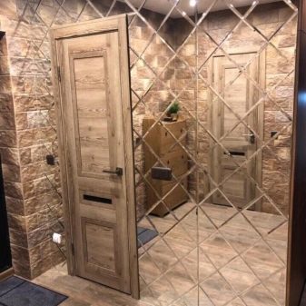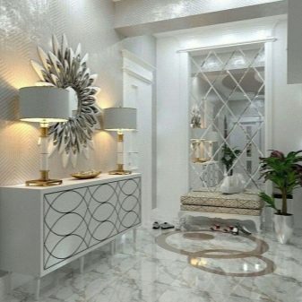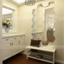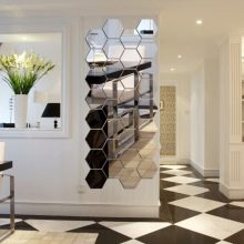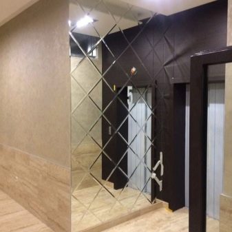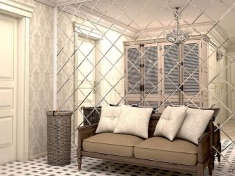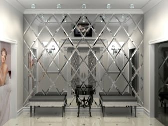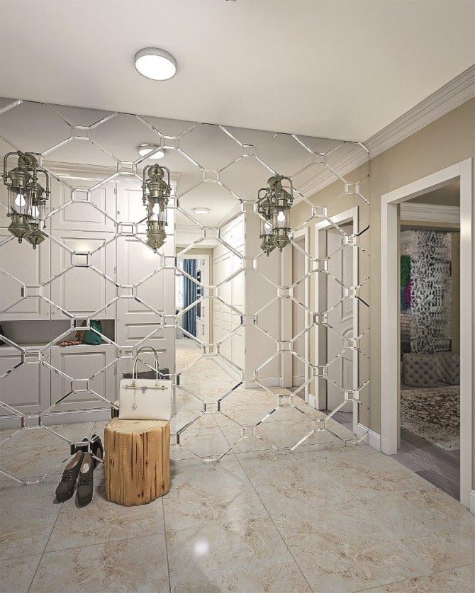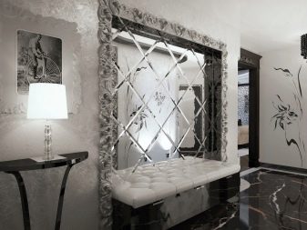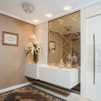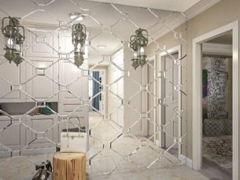 Spiegelfliesen im Inneren des Flurs können ein echter Glücksfall sein. Sie können ganz einfach verschiedene Einrichtungsoptionen nutzen - Paneele an der Wand, abgeschrägte Fliesen und andere Anordnungen im Flur. Sie können sich jedoch nicht auf das Layout beschränken, Sie müssen sich auch mit den Pflegeanforderungen vertraut machen.