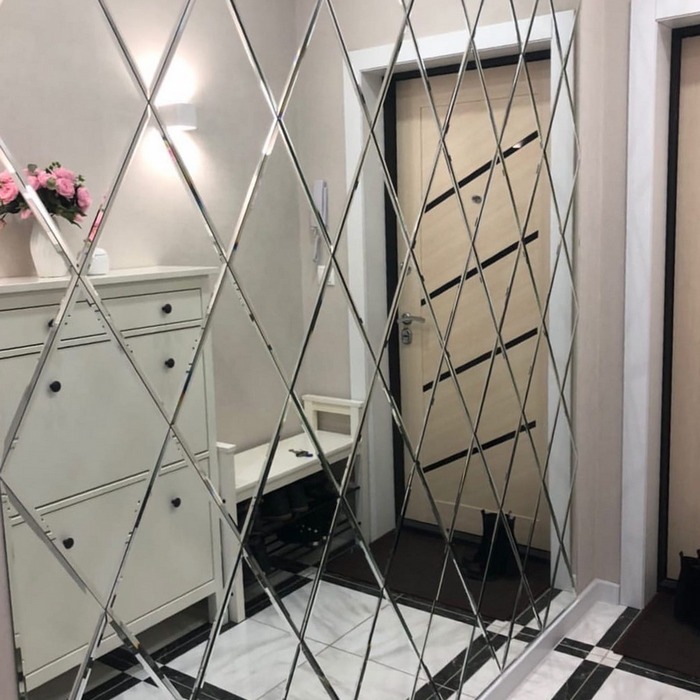 Selbst die engste Flurfläche wird mit Spiegelfliesen wirkungsvoll geschlagen. Sie kaschieren perfekt alle Oberflächenfehler. Und sie werden zu einer hellen Füllung des Innenraums. In Bezug auf die dekorativen Eigenschaften ist eine solche Beschichtung der traditionellen Keramik weit überlegen.