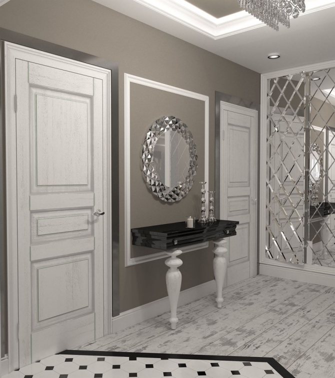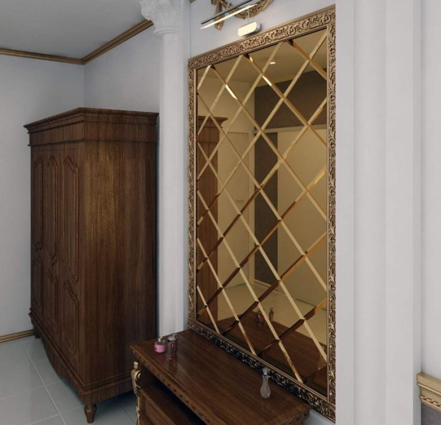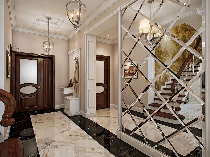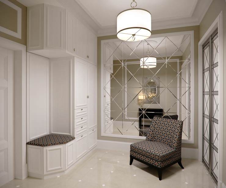 Verspiegelte Fliesen können neben einer betont altmodischen Garderobe sehr attraktiv wirken. Die auf dem Foto gezeigte Lösung entspricht perfekt den Standards eines klassischen Interieurs.