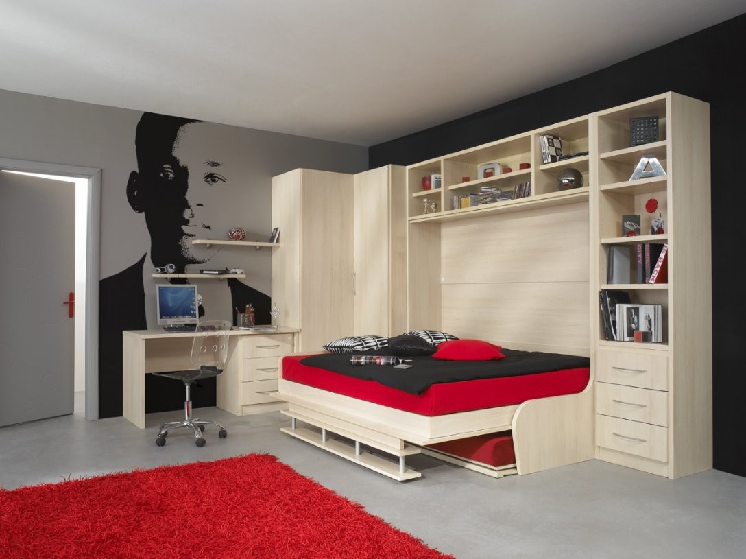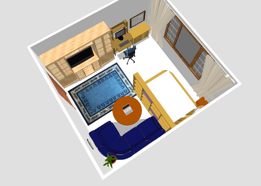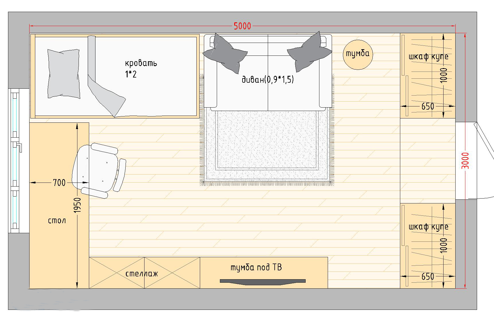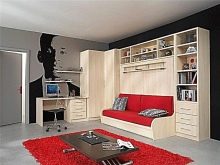 - In diesem Fall ist der Schlafbereich vom Wohnzimmer durch ein Schrankregal getrennt, das durch Regale, Schubladen mit einer Kommodefunktion von der Wohnzimmerseite her umfasst. Der Arbeitsbereich befindet sich gegenüber dem Schlafzimmer.
