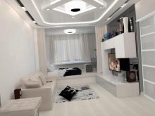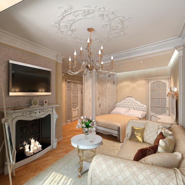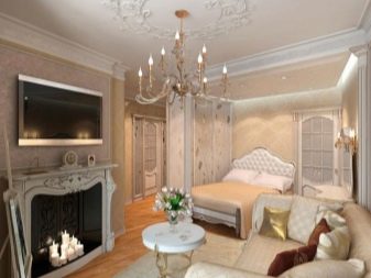 Nachdem Sie einen Schlafplatz reserviert haben, ist bereits klar, wo die Stühle und ein Couchtisch, ein Kleiderschrank für Kleidung und Bettwäsche, an welche Wand der Fernseher aufgehängt werden soll. Dort nimmt er keine kostbaren Zentimeter weg. Möbel für ein Schlafzimmer-Wohnzimmer sollten kompakt und funktional sein, dies macht sie bequem und komfortabel zu bedienen. Eine ihrer Aufgaben ist die visuelle Erweiterung des umgebenden Raumes, wobei die stilistische Orientierung betont wird. Eine Wand mit einem elektrischen, falschen Kamin verleiht dem Raum eine dekorative Wirkung.