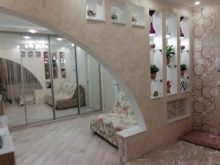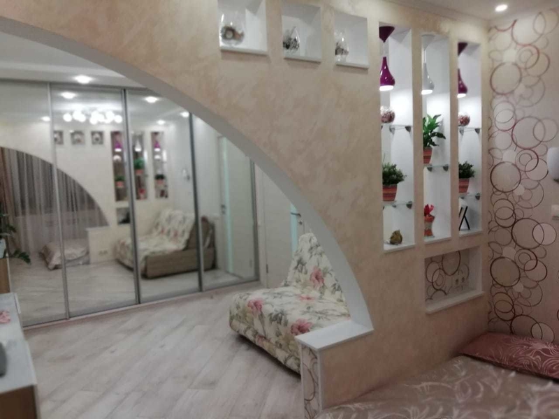 - Der Raum ist mit einer originalen Gipskarton-Trennwand in Zonen unterteilt. Durchgangsnischen dienen der Unterbringung von Dekorationsartikeln oder Rahmen mit Fotografien.
