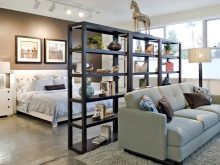 Dies ist eine der beliebtesten Optionen für die Raumaufteilung. Hersteller bieten fertige Modelle an, lehnen jedoch die Ausführung einer Bestellung für ein einzelnes Projekt nicht ab. Solche Trennwände überladen den Raum absolut nicht, machen die Zonierung deutlich und lassen gleichzeitig den Raum luftig. Die Regale können ganz oder teilweise geschlossen sein, in Form von Nischen oder auch geschlossenen Fächern mit Türen. Durchscheinende Regale behindern das natürliche Licht fast nicht, während sie das Schlafzimmer-Wohnzimmer in Zonen aufteilen und dekorieren.