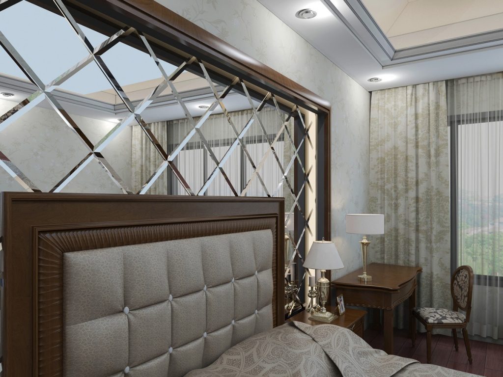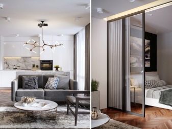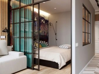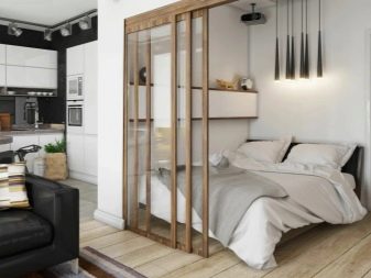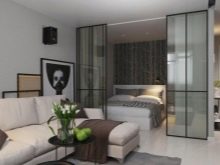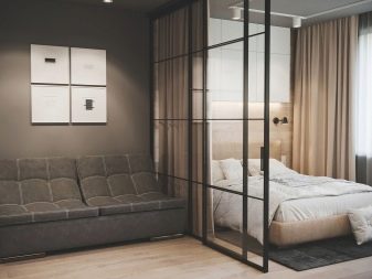 Die Art des Bau- und Veredelungsmaterials für die Trennwand hängt vollständig von den Vorlieben der Eigentümer, der Stilrichtung und der Innenarchitektur ab. Trennwände können aus Glas und Metall, Kunststoff und Spiegeln bestehen, mit ihrer Hilfe können Sie den Effekt von Buntglasfenstern erzeugen, die den Raum mit einem Farbspektrum und weichem diffusem Licht mit getönten Tönungen füllen. All dies erweitert optisch das Wohn-Schlafzimmer.