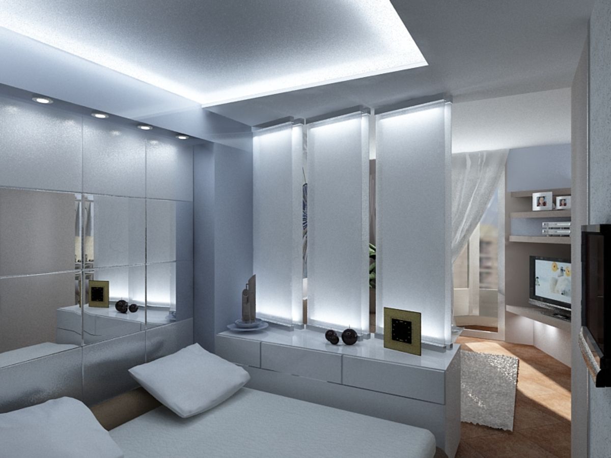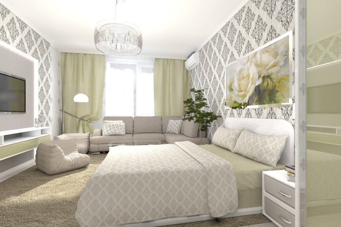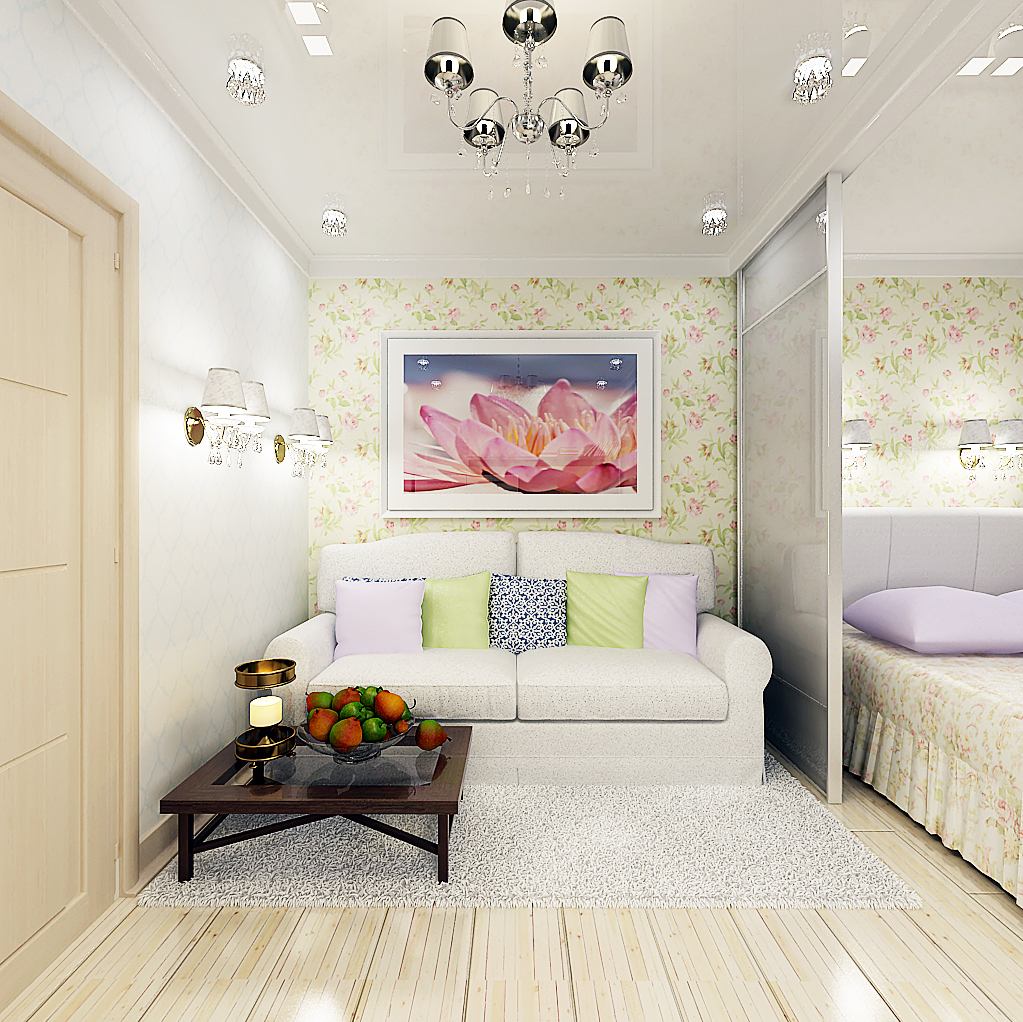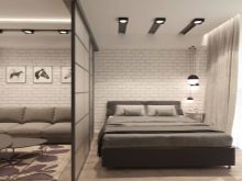 Bei der Beleuchtung eines kleinen Raumes, der gleichzeitig als Wohn- und Schlafzimmer fungiert, kommt kombiniertes Licht zum Einsatz. Ein Kronleuchter an der Decke ist eine unangemessene Lösung des Problems, die die positive Wirkung der geleisteten Arbeit beeinträchtigen kann. Die Einteilung in Zonen erfordert Licht unterschiedlicher Intensität.