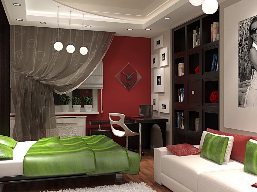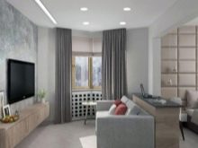 Sie können einen Raum jeder Größe für das Leben bequem machen - sowohl zu groß als auch zu sehr klein - zum Beispiel 16 qm. m) Die Hauptsache ist, das Problem rational anzugehen. Bei begrenzten Ressourcen wie Filmmaterial müssen Sie versuchen, eine Überfüllung der Möbel zu vermeiden. Eine der effektivsten Methoden ist die Zonierung des Wohnzimmers. Im Schlafzimmer-Wohnzimmer von 16 Quadratmetern werden Regale oder Zwischenwände aus Gipskartonplatten, künstliche Trennwände von Bildschirmen, Textil- und andere Vorhänge, Podeste usw. verwendet.