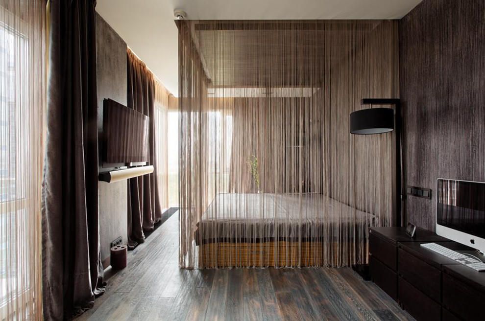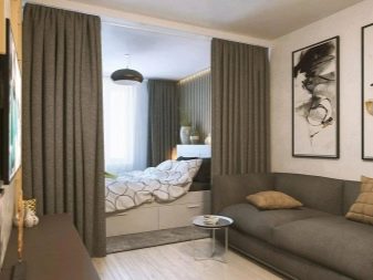 - Zonierung mit Textil- und Garnvorhängen. Im ersten Fall machen die geschlossenen Tücher aus dichten Textilien den Schlafraum für den Wohnbereich absolut undurchdringlich. Im zweiten bezeichnet die Verwendung von dekorativen Filamentvorhängen nur den Schlafbereich.