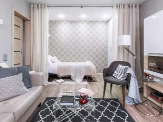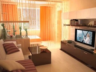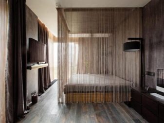Es ist manchmal sehr schwierig, in einem solchen Raum starre Strukturen zu verwenden - sie stören die Bewegung. Sie können nicht nur mit dichten Stoffarten arbeiten. Lichtdurchlässige Leinwände spielen die Rolle von Trennwänden nicht weniger gut, wenn das Interieur bis ins kleinste Detail durchdacht ist - Organza, Musselin, aber Filamentvorhänge mit Perlen, Strasssteinen und auch ohne unnötige Dekorationen wirken besonders beeindruckend. Darüber hinaus werden Jalousien, japanische Matten, Bambusvorhänge usw. verwendet.