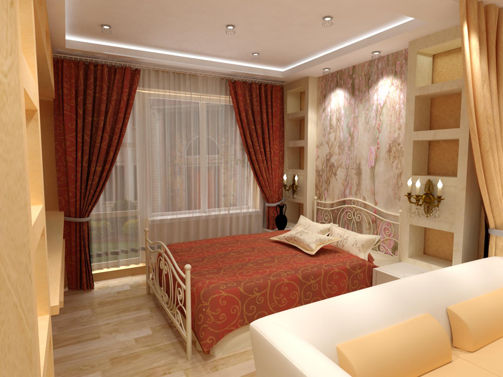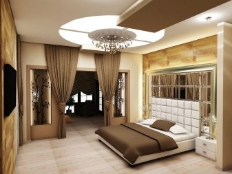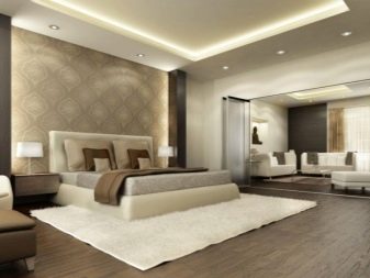 Darüber hinaus "funktionieren" Strahler perfekt entlang des gesamten Deckenumfangs. Bei der Dekoration eines Schlafzimmer-Wohnzimmers müssen Sie ein Minimum an hellen Elementen verwenden, um die visuelle Wahrnehmung eines begrenzten Raums nicht zu überlasten.
