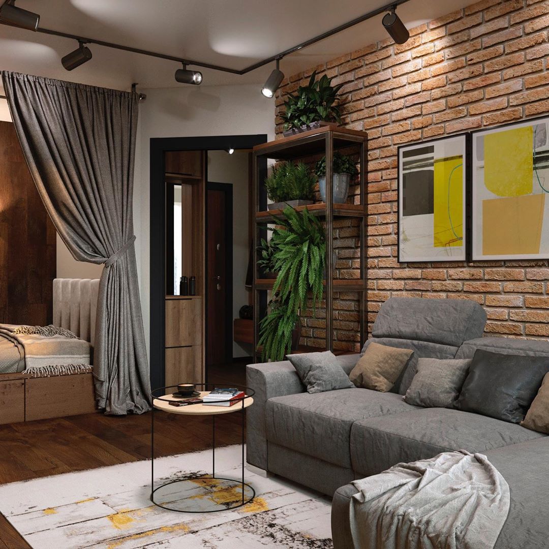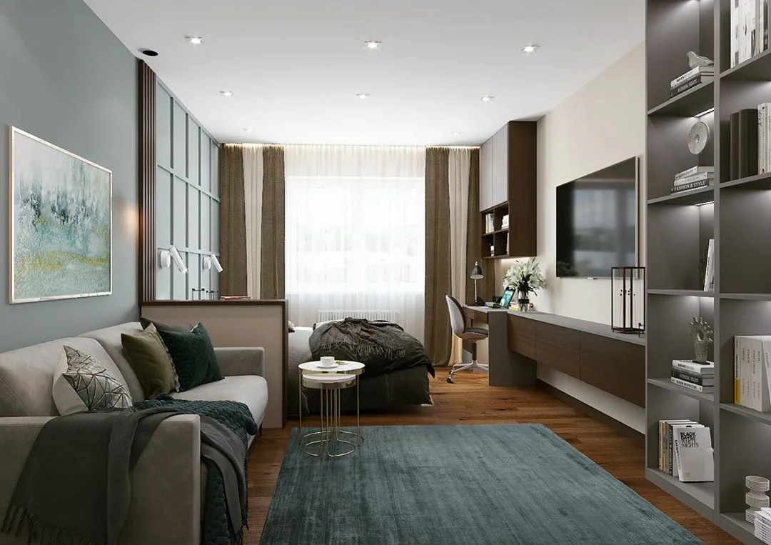 Textilien helfen in Fällen, in denen sich das Wohn-Schlafzimmer in einem nicht standardmäßigen Raum befindet, z. B. L-förmig, schmal und länglich, wie ein Federmäppchen.