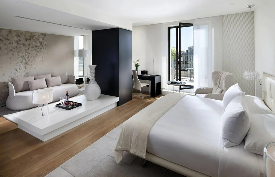Der Stil zeichnet sich durch lakonische und dezente Möbel, angenehme Beleuchtung und durchdachte Funktionalität aus, die dem Interieur nur Raffinesse verleihen. Leichtes, strenges Design erweitert den kleinen Raum optisch. Es werden helle Farben verwendet, die in einer kleinen Wohnung oder einem Studio am besten geeignet sind. Bei Accessoires sind Einschränkungen und Mäßigung erforderlich - Minimalismus mag keine übermäßige Dekoration und jede Menge Möbel.