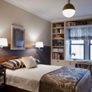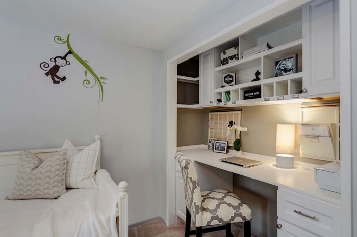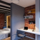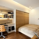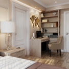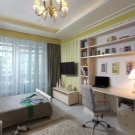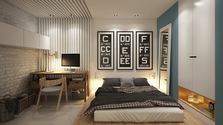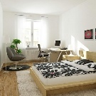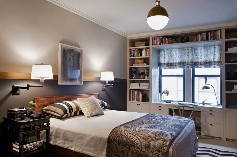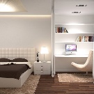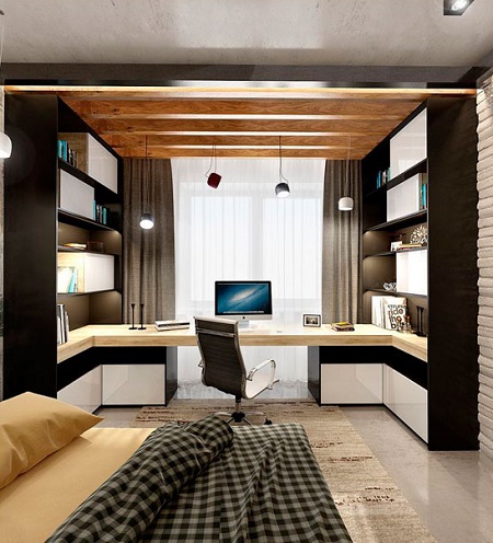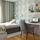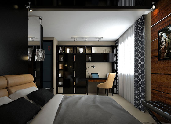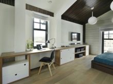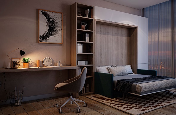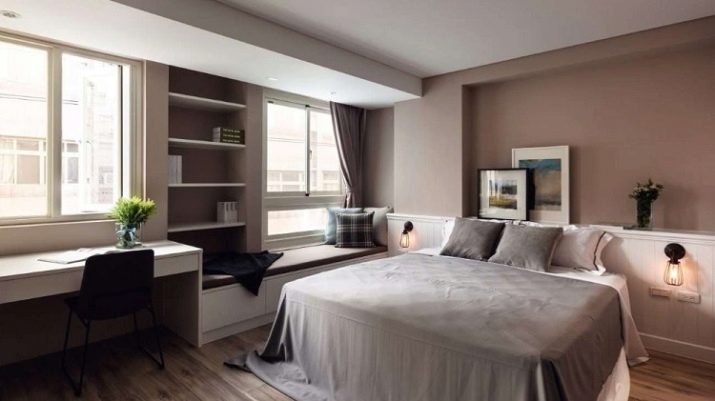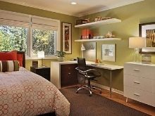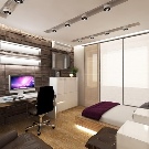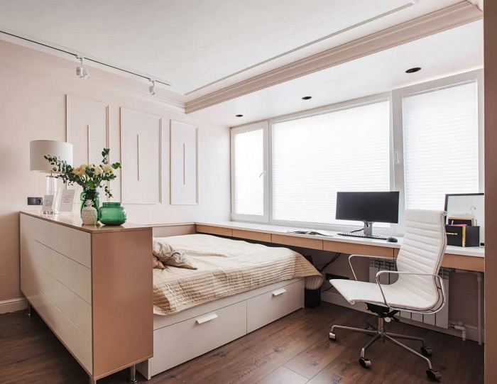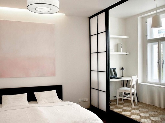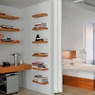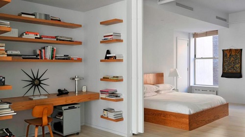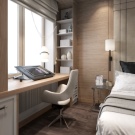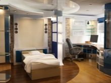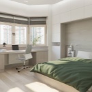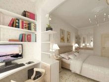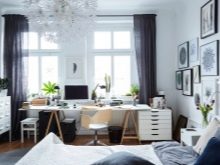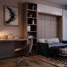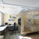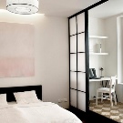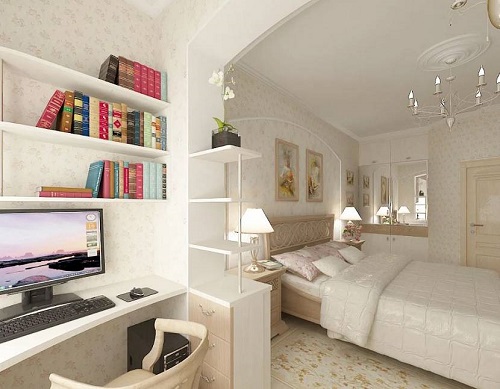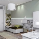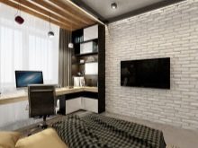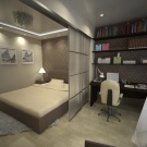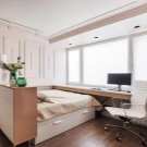 Ein kleiner Raum ist mit umwandelbaren Möbeln ausgestattet. Dies kann entweder ein Klappsofa oder ein funktionaleres Möbelstück sein (z. B. ein Regal mit einem eingebauten Sofa und einem Regal). In Wohnungen mit einer Kombination von Räumen kann die Zonierung des Schlafzimmer-Arbeitszimmers unterschiedlich sein. Häufig werden modulare Systeme verwendet, um kombinierte Räume auszustatten. Sie zeichnen sich durch ihre Kompaktheit und maximale Funktionalität aus.