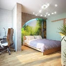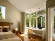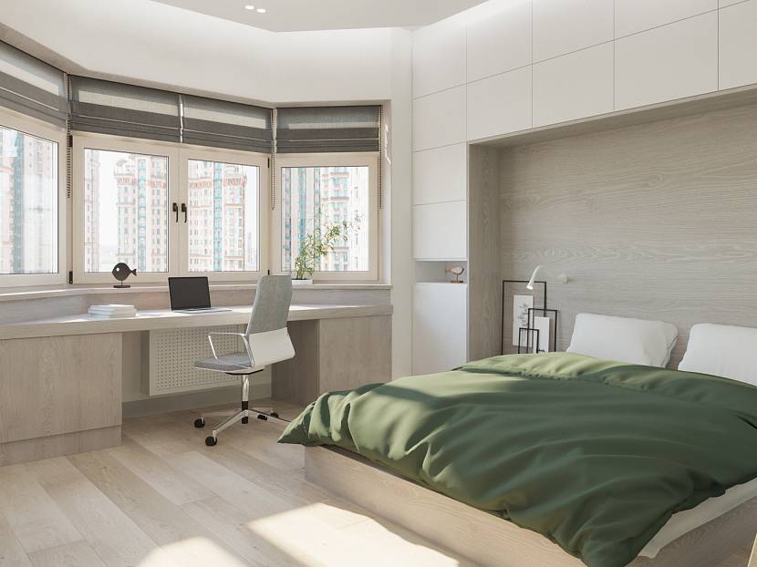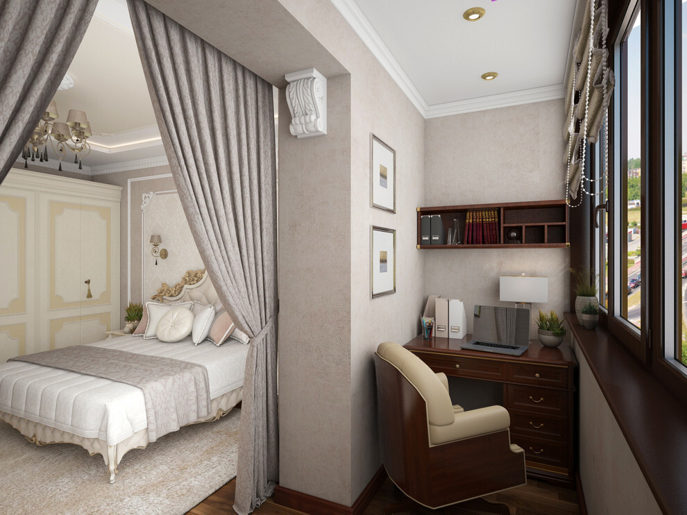 In diesem Fall können Sie einen Arbeitsbereich ausstatten, der in das Schlafzimmer geht. Die Trennung zwischen Balkon und Zimmer kann unterschiedlich sein (durch Bogen, Schiebetür, Fensterausbau). Dies ist ein ideales Design für ein Schlafzimmerarbeitszimmer für kleine Wohnungen.