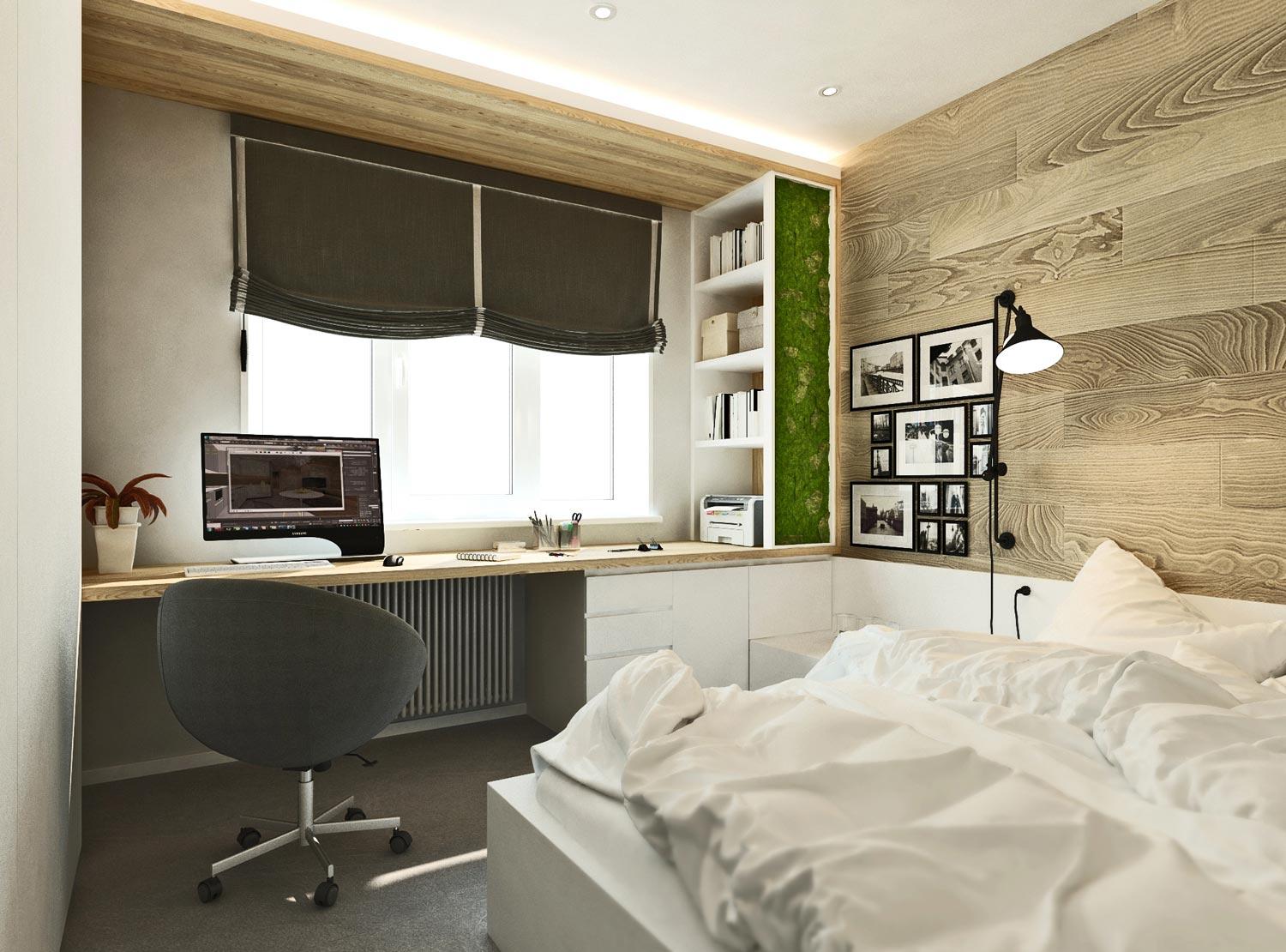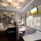 Ein Schlafzimmer-Arbeitszimmer ist ein Ventil für diejenigen, die von zu Hause aus arbeiten. Die Kombination von zwei Zonen (Schlafen und Arbeiten) gilt als universelle Option für das Innere der Wohnung.
