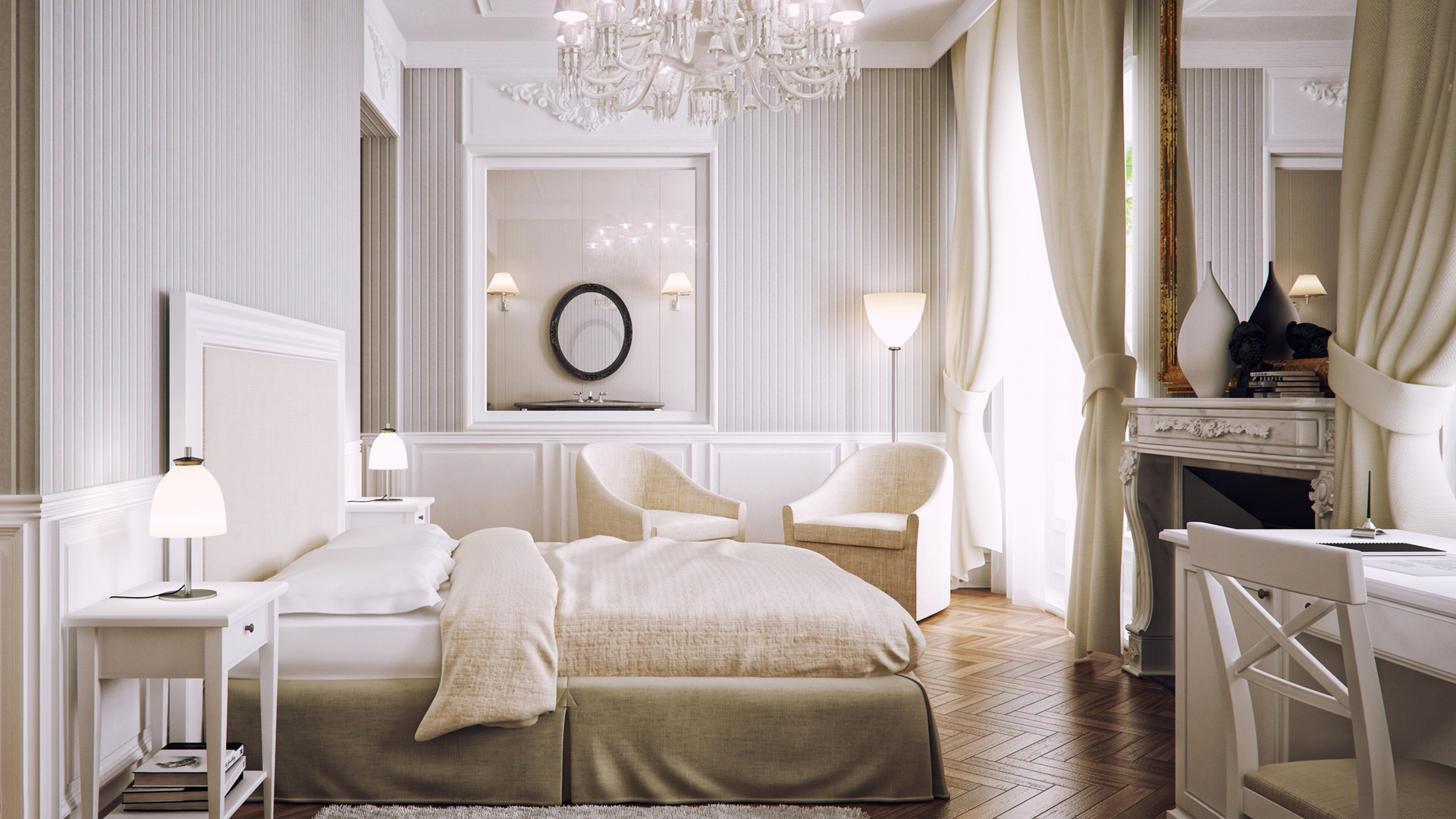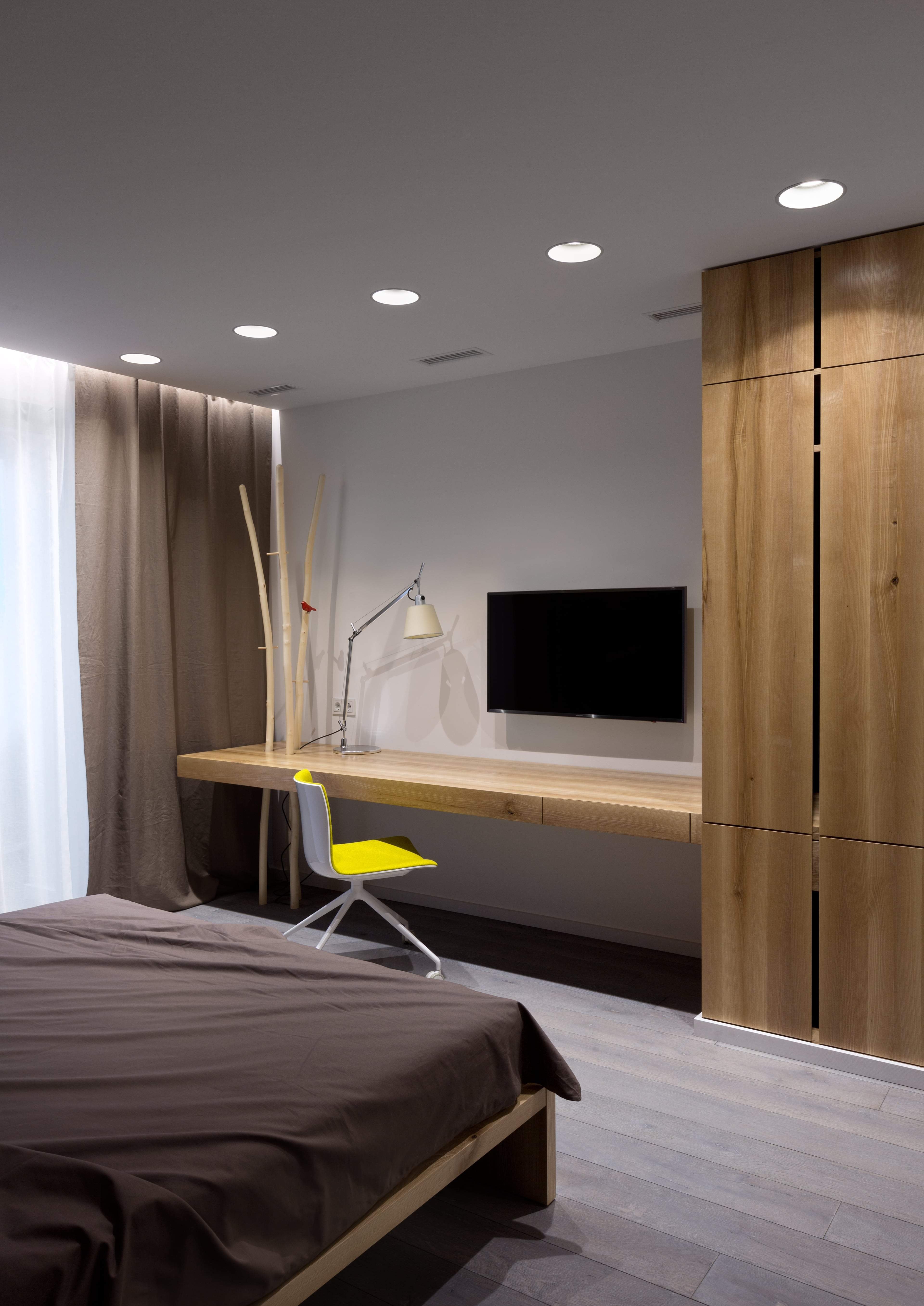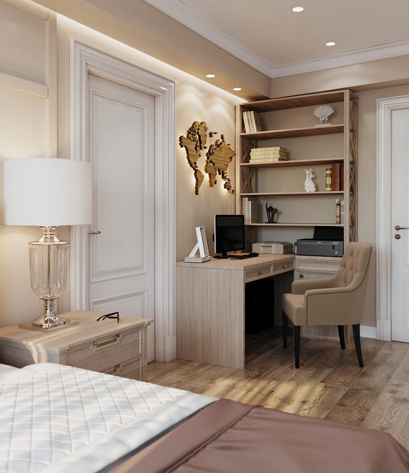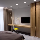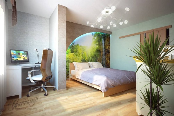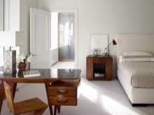 Die Zonierung eines Schlafzimmers und eines Arbeitszimmers im selben Raum kann unterschiedlich sein. Durch Beleuchtung, Wand, Bodenbelag und auch Möbel ist es möglich, den Raum unauffällig in separate Funktionszonen zu unterteilen. Gleichzeitig ist es notwendig, die Gesamtintegrität des Raumes zu erhalten. Bei der Zonierung eines Zimmers in einer Stadtwohnung oder einem Privathaus werden 2/3 für einen Schlafplatz und 1/3 für einen Arbeitsbereich zugewiesen. Dabei folgt die Aufteilung den Besonderheiten der Raumperspektive.