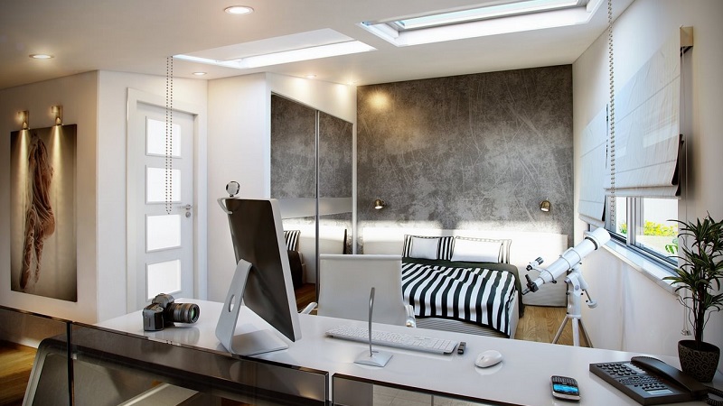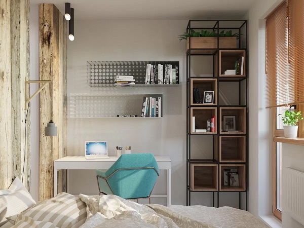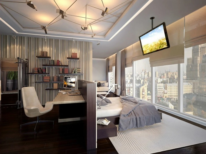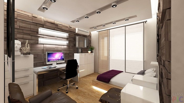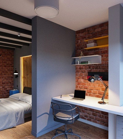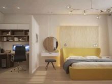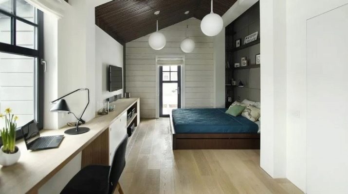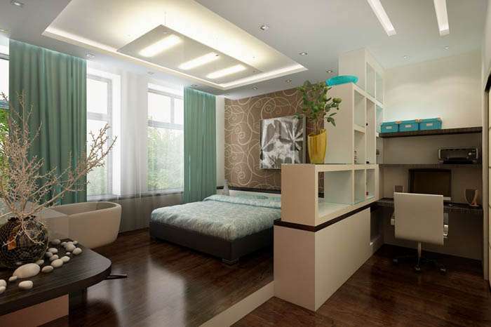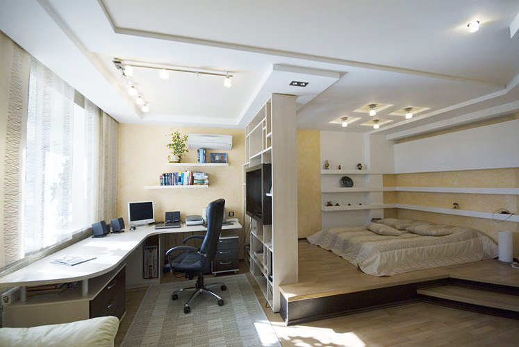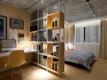 Allerdings muss die Anordnung der Möbel im Arbeitsbereich stimmen. Ein Überangebot an Einrichtungsgegenständen kann den natürlichen Lichteinfall im gesamten Raum reduzieren, was ihn ungemütlich machen kann. In einem engen Raum werden Möbel linear installiert. Gleichzeitig bleibt an einer der Wände freier Platz, um sich im Raum zu bewegen. Gleichzeitig sollte der Arbeitsbereich besser beleuchtet sein als der Schlafbereich. Bei dieser Aufteilung kann der Raum durch eine Trennwand oder Trennwand unterteilt werden. Zum Beispiel können ein Regal, ein Sofa, ein Regal, eine Stehlampe zu einem Teiler werden.