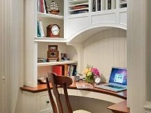 Eine Aufbewahrungsnische kann zu einem kompakten und bequemen Arbeitsplatz werden. Sie können einen kleinen Tisch und einen Stuhl hineinstellen und die Regale für das nötigste Zubehör für die Arbeit verwenden. Wohnen andere Haushaltsmitglieder im Raum, ist es besser, den Heimarbeitsbereich mit einem Sichtschutz oder Textilvorhang abzutrennen.