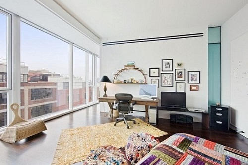 Wenn der Raum mit einem Balkon oder einer Loggia kombiniert wird, kann sich dort das Büro befinden. Dazu ist es erforderlich, dass der Zustand des Balkons (Loggia) technisch gut ist. Außerdem, Dieser Teil der Wohnung muss isoliert und verglast sein.