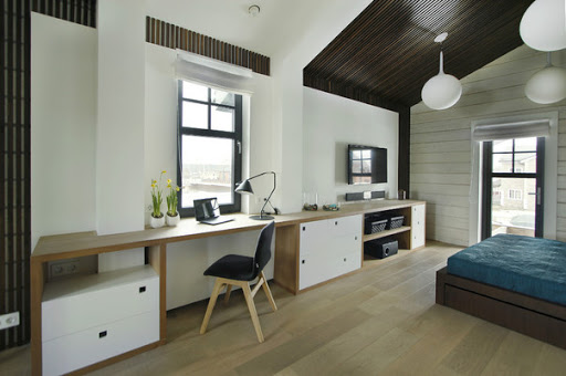 Die Aufteilung in Funktionszonen impliziert eine strenge Herangehensweise an die Anordnung der Möbel. Der Schlafbereich sollte keine Regale oder Regale mit Dokumenten sowie einen Schreibtisch enthalten. In diesem Fall ist es schwierig, die notwendige Atmosphäre zu schaffen. In einem traditionellen rechteckigen Raum befindet sich der Arbeitsbereich am Fenster.Hier stellen sie einen Schreibtisch und das notwendige Zubehör ab. Das Bett befindet sich im hinteren Teil des Zimmers. Bei dieser Art von Möbeln erhellt tagsüber natürliches Licht den Arbeitsbereich, der für die Arbeit notwendig ist.