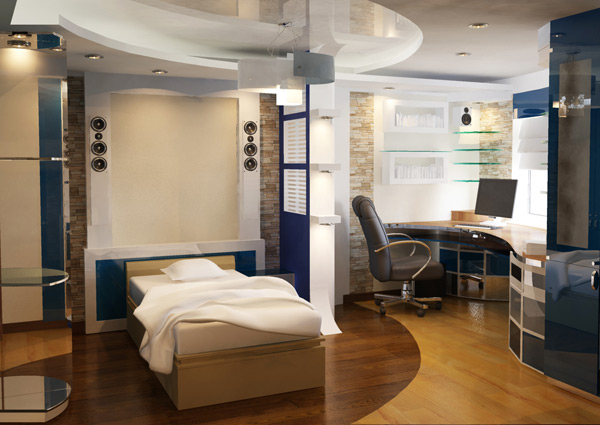 In diesem Fall sollte sich der hellere im Schrankbereich befinden. Diejenige, mit der der Ruheplatz beleuchtet wird, sollte sanft und gedämpft sein. Sie können den Arbeitsbereich beleuchten, indem Sie Stehlampen, Wandlampen, Deckenlampen... Sie können einen Liegeplatz bestimmen LED-Leisteindem Sie es an der Decke hinter der Leiste oder dem Gesims platzieren. Außerdem kann diese Zone ausgewählt werden durch Flecken, Scheinwerfer oder andere Scheinwerfer Einbau- oder Überkopftyp. Die Leuchtensteuerung kann klassisch oder ferngesteuert sein.