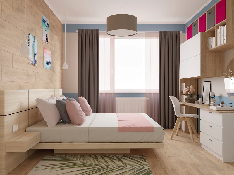 - Für eine junge Frau ist ein Interieur in Pastellfarben vorzuziehen. Helle Farbtöne verleihen dem Raum eine Atmosphäre von Leichtigkeit und Leichtigkeit. Der Stil kann unterschiedlich sein, er wird unter Berücksichtigung der Bedürfnisse des Raumbesitzers ausgewählt.