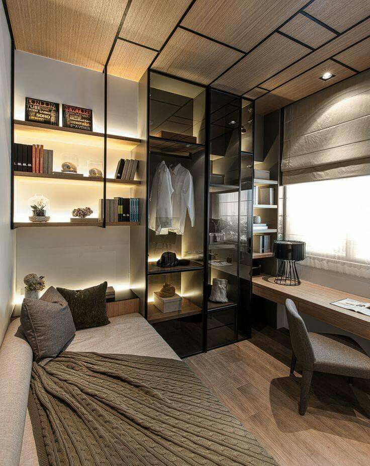 - In einer kleinen Wohnung können Sie einen modernen Stil als Grundlage für den Stil wählen, zum Beispiel Minimalismus. Es gibt nichts Überflüssiges, es ist ein Schwerpunkt auf Funktionalität ohne unnötige Dekoration des Raumes. Dies ist eine großartige Wahl der Inneneinrichtung für ein Herrenzimmer. Die Farbgebung kann neutral oder hell sein. Es handelt sich um faltbare oder umwandelbare Möbel.