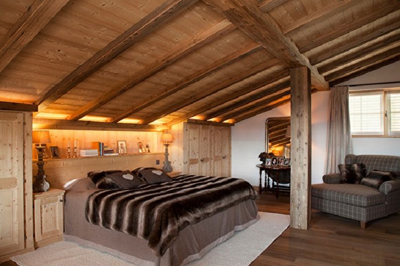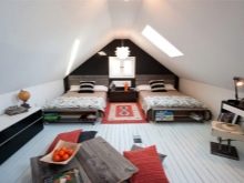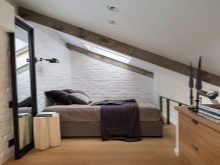 Das großzügige Dachgeschoss mit Holzbalken an der Decke kann im angesagten Loft-Stil eingerichtet werden. Die Dekoration eines solchen Raumes sieht normalerweise einfach, aber gleichzeitig schön aus. Die Wände sind mit Mauerwerk oder Putz verziert. Der Nachtbereich ist oft mit dunklem Holz dekoriert und hebt so einen separaten Sitzbereich hervor. Holz- und Metallmöbel sehen in einem solchen Raum gut aus.