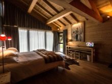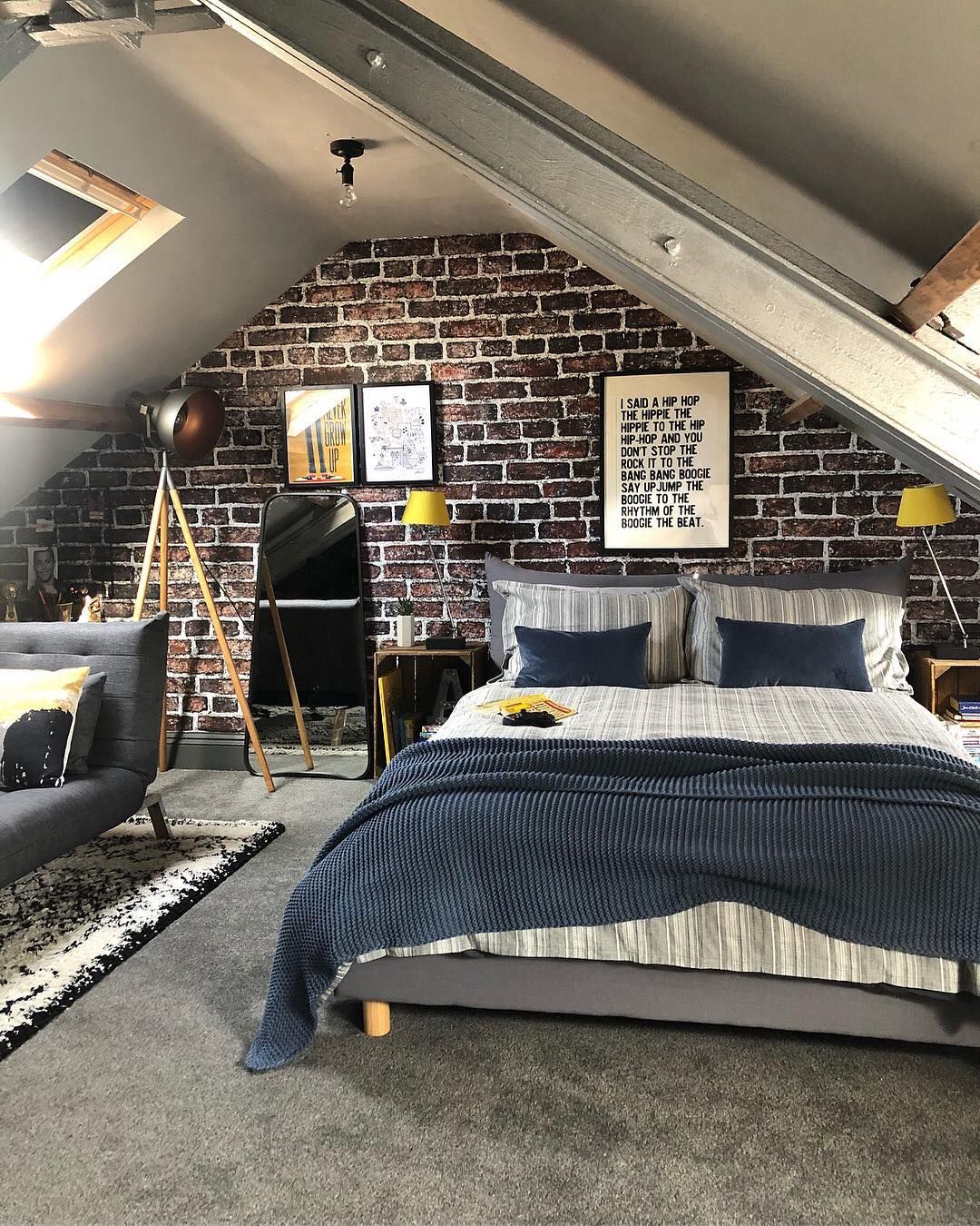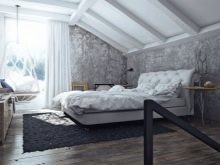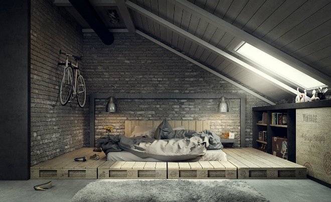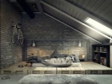 Trotz der Tatsache, dass ein solcher Raum in dunklen Farben gehalten ist, sieht er ziemlich stilvoll aus. Die Wände des Raumes sind mit Mauerwerk verkleidet, die Decke ist aus grauem Holz. Das Bett befindet sich auf einem niedrigen Holzpodest. Daneben befindet sich ein Stauraum.