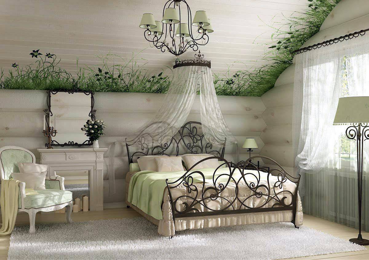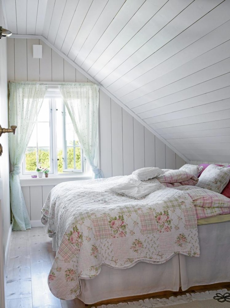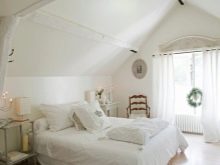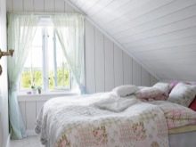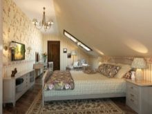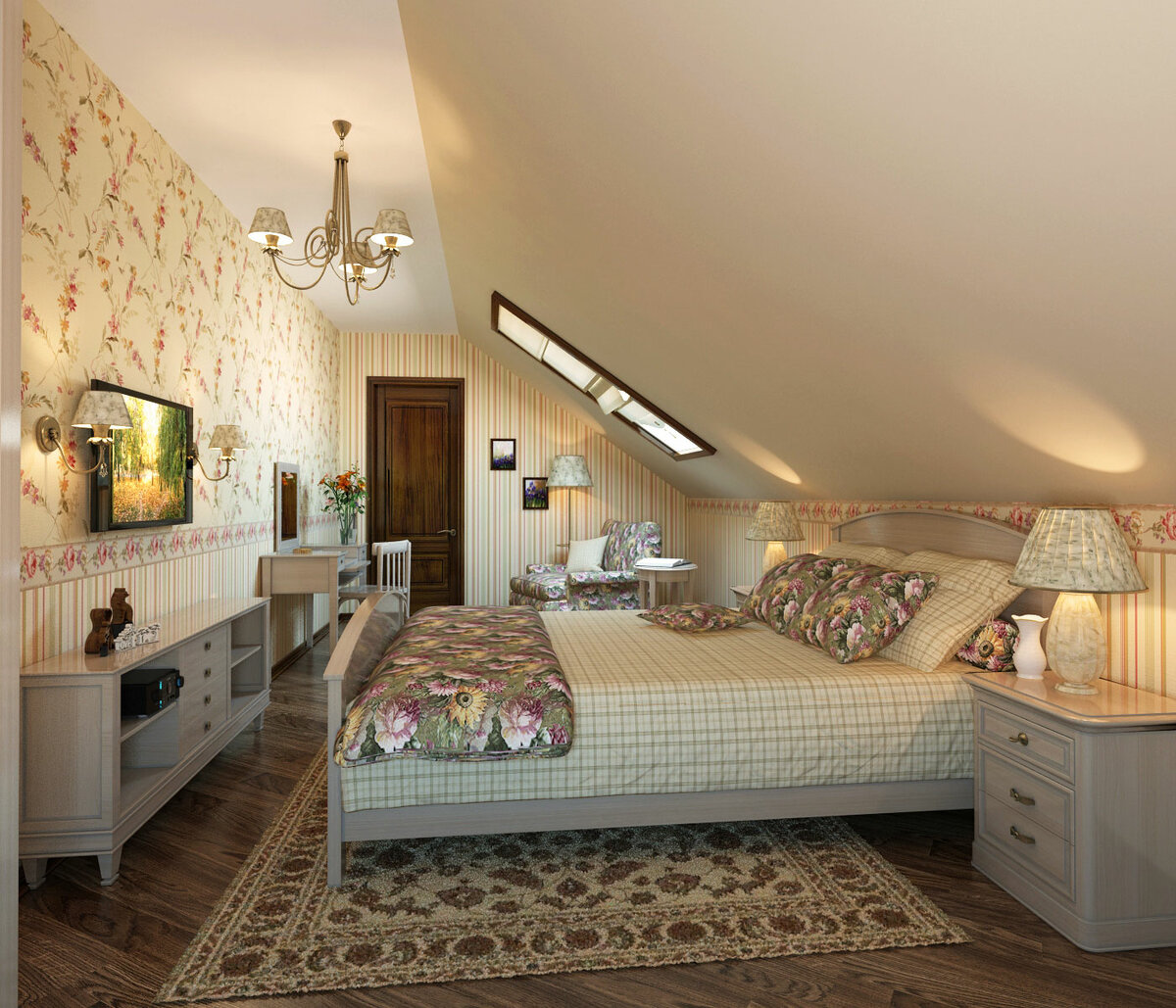 Dieser romantische Stil ist perfekt für kleine Schlafzimmer im Dachgeschoss. Bei der Dekoration von Wänden wird normalerweise viel Naturholz, Stein und Ziegel verwendet. Möbel für einen solchen Raum eignen sich für weich und bequem. In der Regel ist es in angenehmen Pastellfarben gehalten. Sehr oft wird das Interieur durch passende Vorhänge, Vorleger und Teppiche ergänzt. Das Zimmer erweist sich als gemütlich und ideal zum Entspannen.