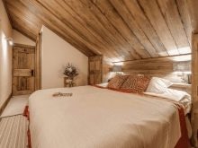 Die Decken in diesen Schlafzimmern sind normalerweise sehr hell gemacht. Holzböden können leicht in ein fertiges Projekt integriert werden. Dies ist jedoch nur in Räumen mit hohen Decken möglich.