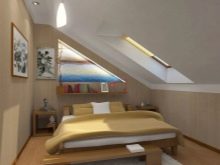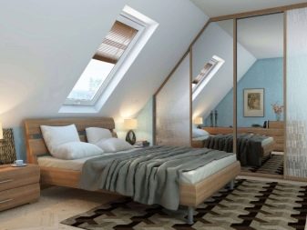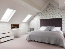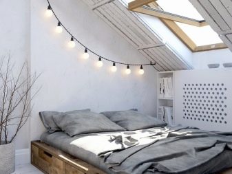 Bei der Einrichtung eines Schlafzimmers in einem Dachzimmer wird empfohlen, kompakte und funktionale Möbel zu kaufen. Achten Sie also auf kompakte Klappsofas, Betten mit Stauraum, Klapptische.