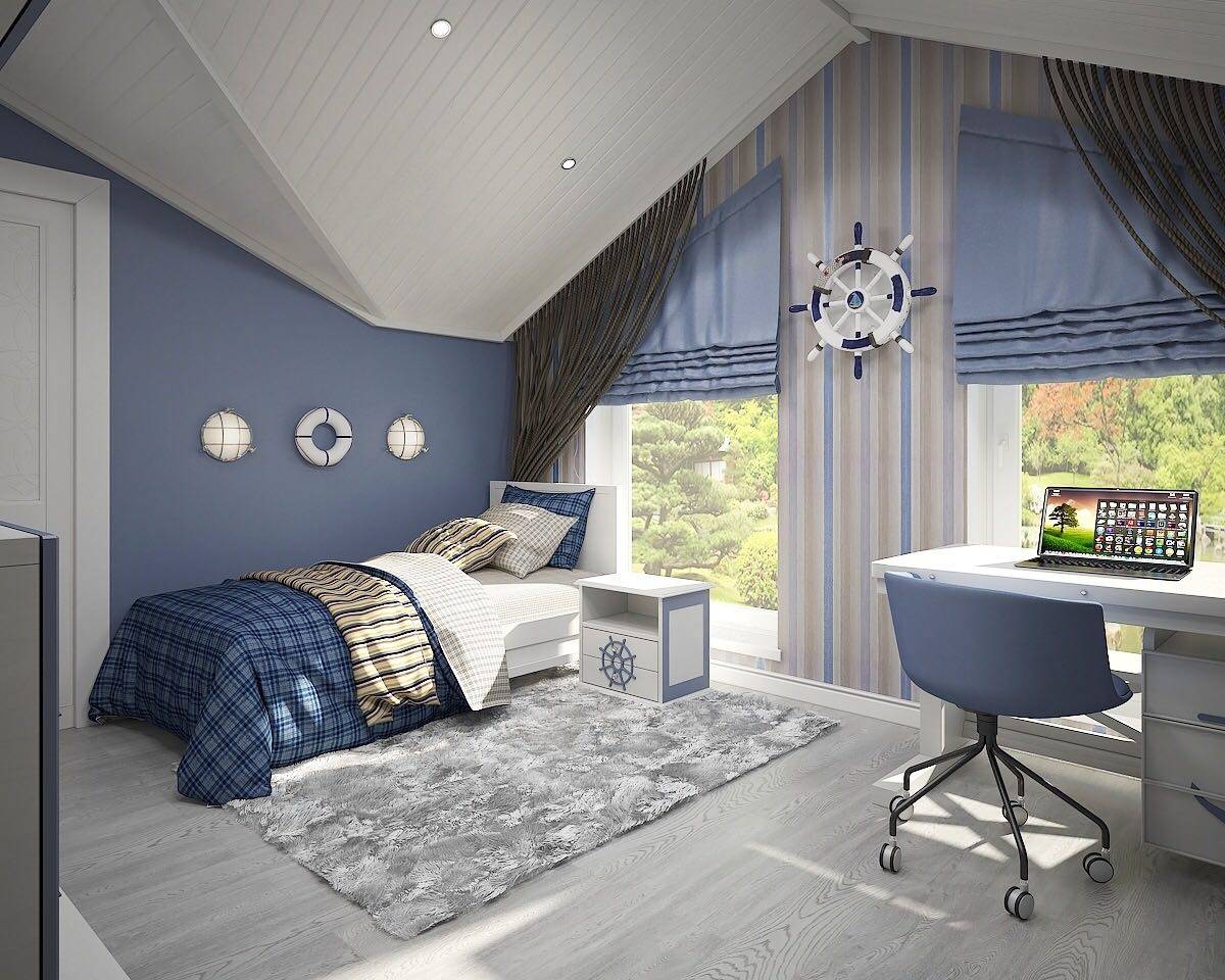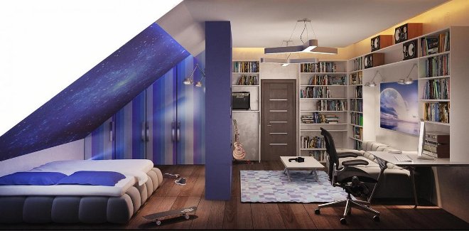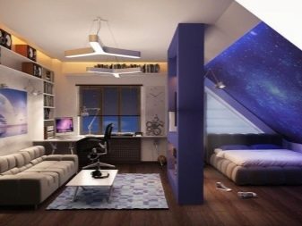 Ein geräumiger Dachboden ist ein großartiger Ort, um ein Kinderzimmer zu platzieren. Damit sich das Kind in einem solchen Raum geräumiger fühlt, ist der Raum in zwei Teile unterteilt. Einer spielt die Rolle eines Schlafzimmers, der zweite - ein Büro und ein Erholungsbereich. Der Raum wird durch eine breite Trennwand in Blau in Teile geteilt.