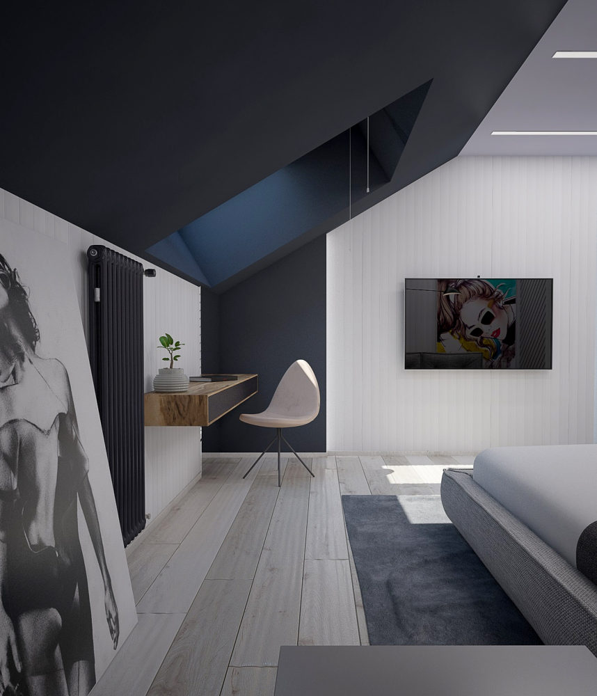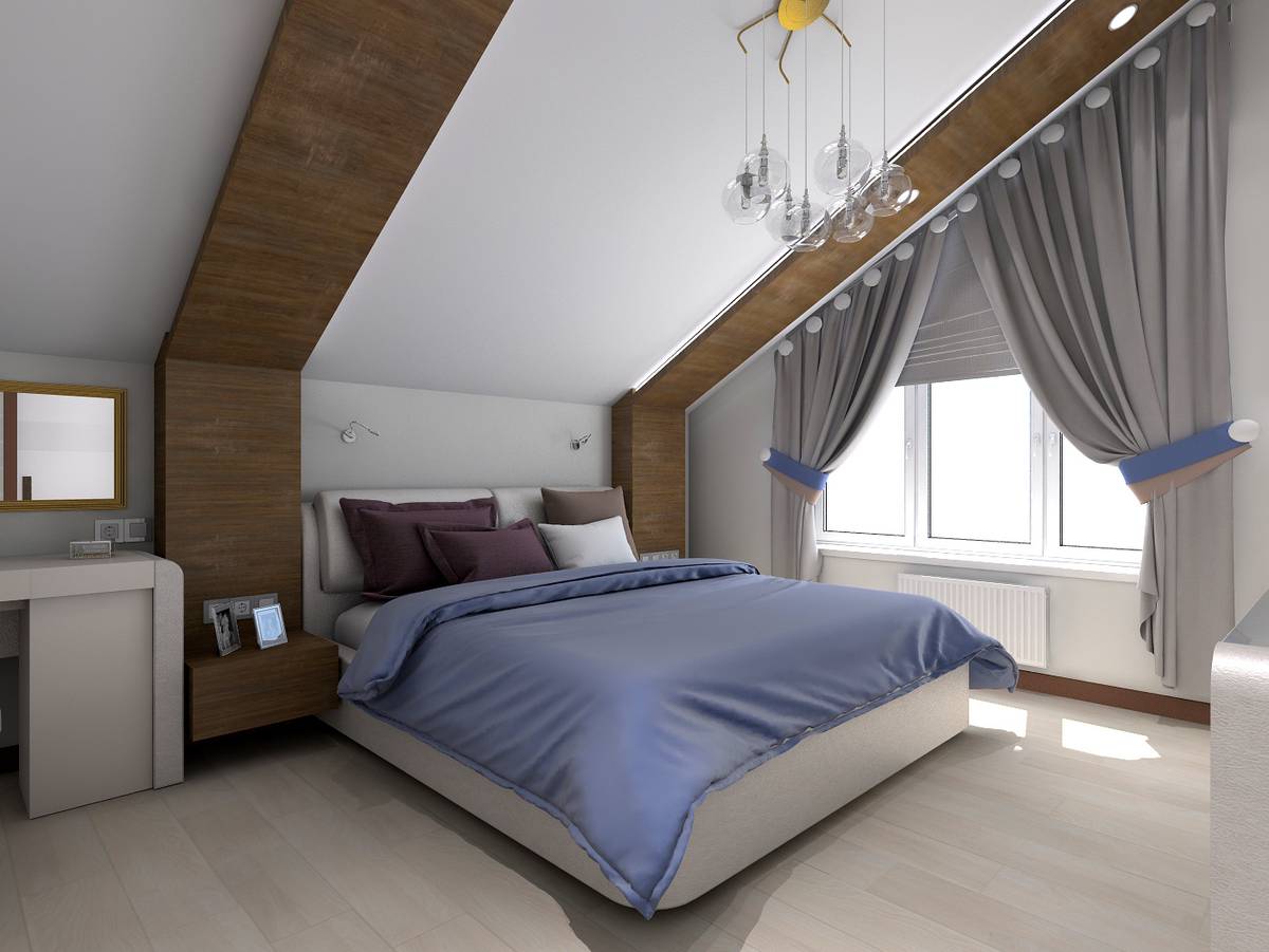 Noch komfortabler ist das Wohnen in einem Dachzimmer mit Balkon. Bei der Planung lohnt es sich, jeden freien Zähler zu nutzen. Im Hauptteil des Raumes mit schräger Decke können Sie also einen Schlafplatz platzieren. Der Balkonraum ist in der Regel einem Ankleidezimmer sowie einem Ort für Arbeit oder Kreativität vorbehalten.