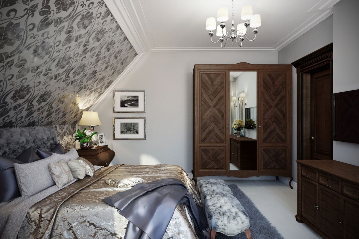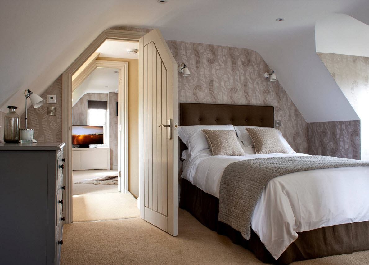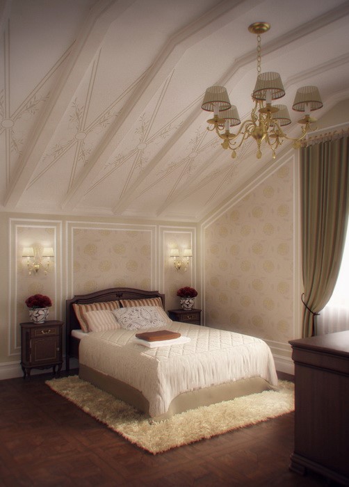 Wer eher zurückhaltende Klassiker bevorzugt, wird das in diesem Stil eingerichtete Schlafzimmer im Dachgeschoss auf jeden Fall lieben. Um es bequemer zu machen, lohnt es sich, eine gute Verarbeitung aus natürlichen Materialien zu verwenden. Hochwertiges Holz lässt sich mit Textilien und Naturstein kombinieren.