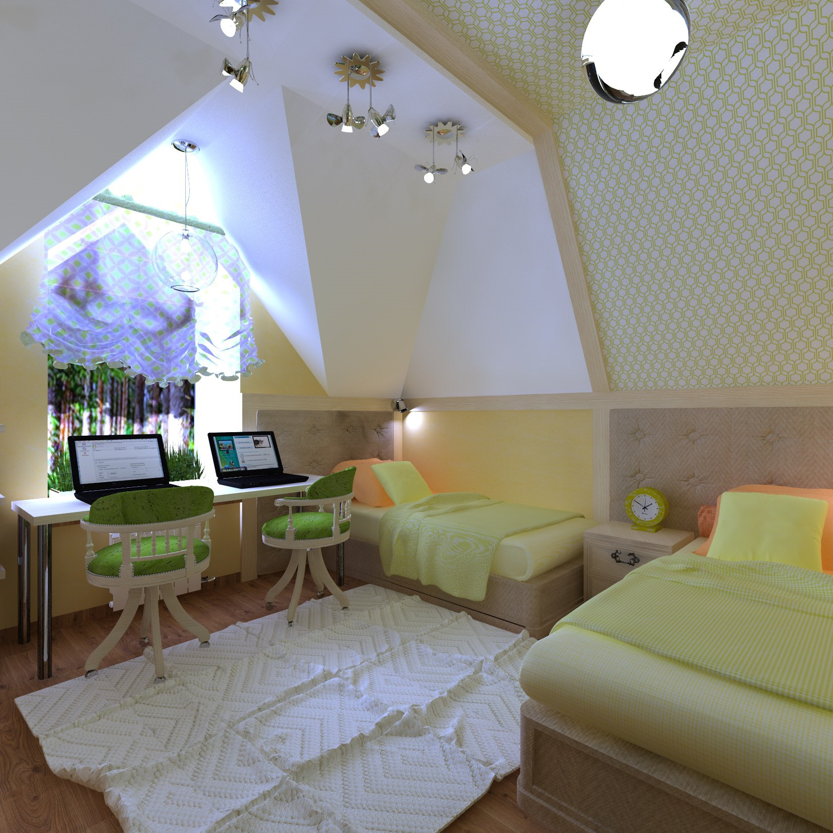 - Giebel. Im Dachgeschoss mit dieser Aufteilung gibt es viel mehr Freiraum. Wenn Sie den Raum mit Trennwänden unterteilen, ist Platz für zwei Kinderzimmer. Zusätzlich kann ein Schlafzimmer mit einem begehbaren Kleiderschrank oder Badezimmer ergänzt werden. Ein solches Projekt ist perfekt für ein Zuhause, in dem Vertreter mehrerer Generationen leben.