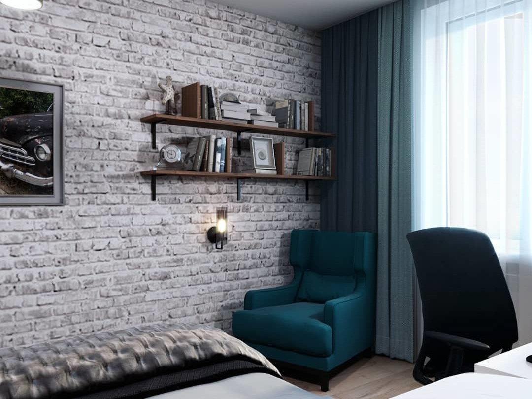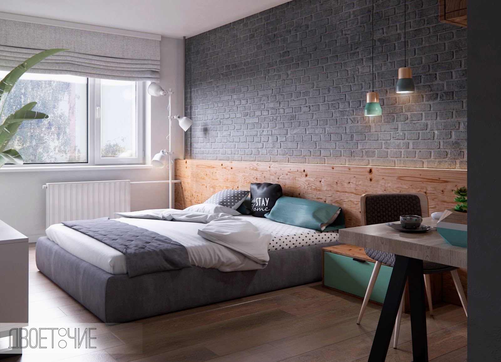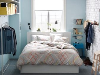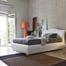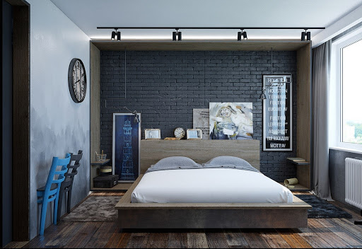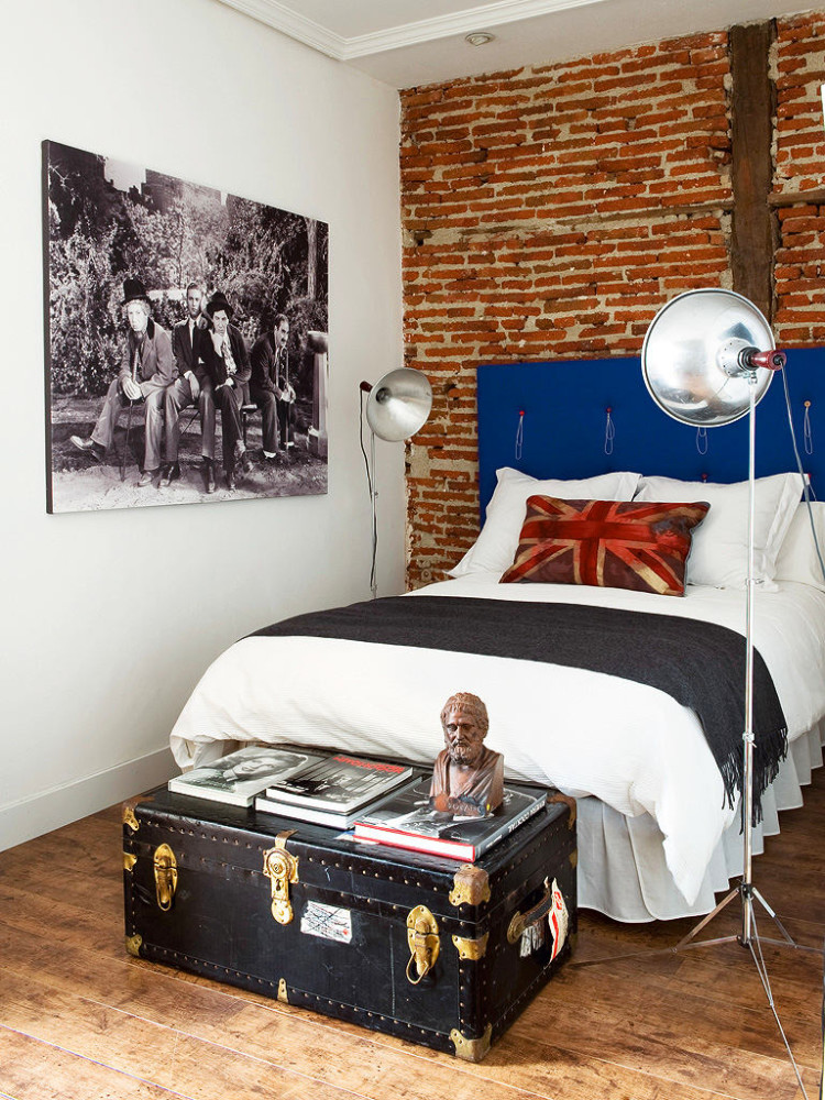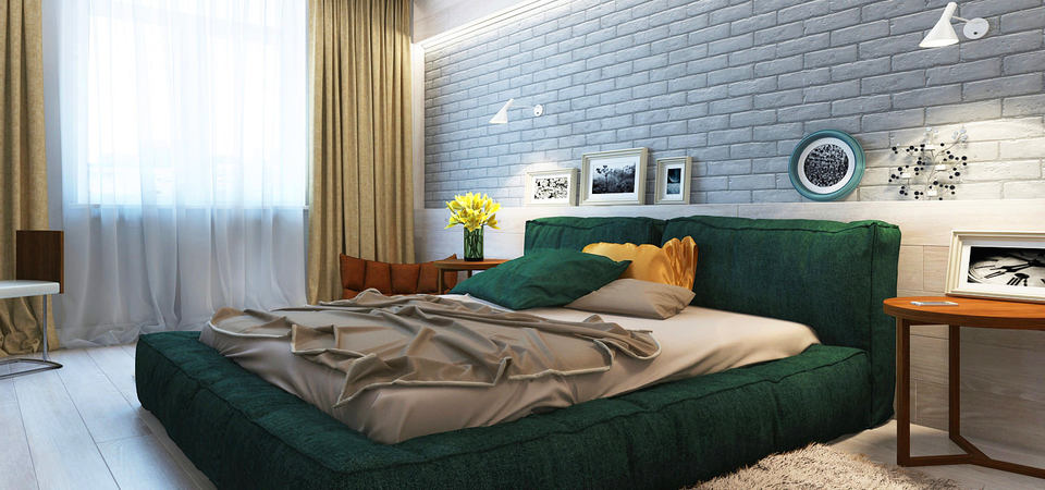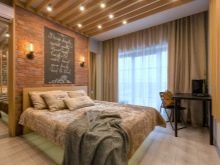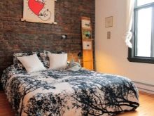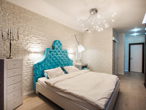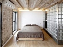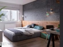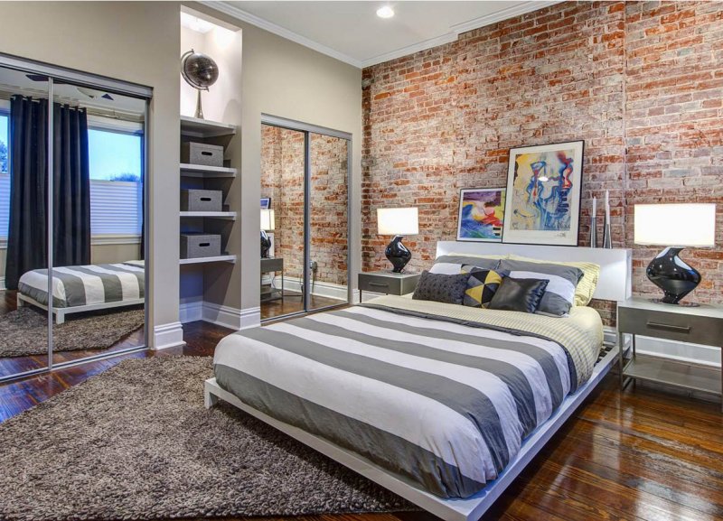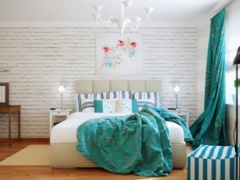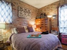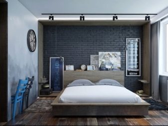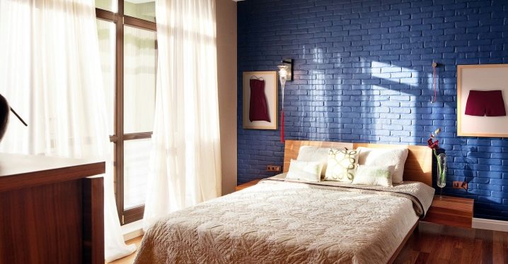 Es wird im Inneren des Schlafzimmers interessant aussehen blaues Mauerwerk... Außerdem kann es mit Naturholzböden und beigen Wänden kombiniert werden. In diesem Fall wirkt die Ziegeloberfläche als Akzent. Gleichzeitig kann das Bett in einer hellbraunen Farbe hergestellt werden.Damit das Design nicht langweilig wirkt, sollte es mit dekorativen Gemälden oder interessanten kleinen Lampen leicht verdünnt werden.