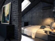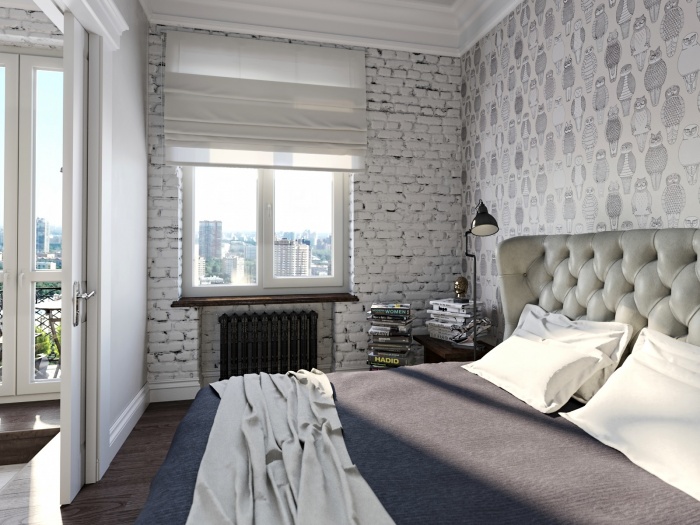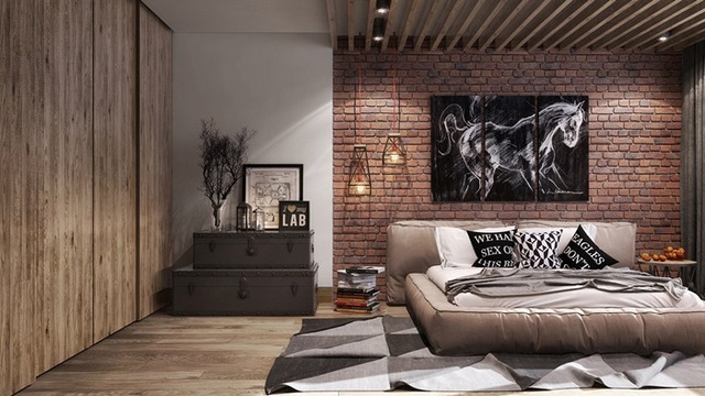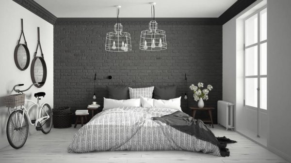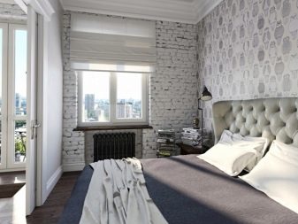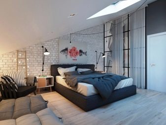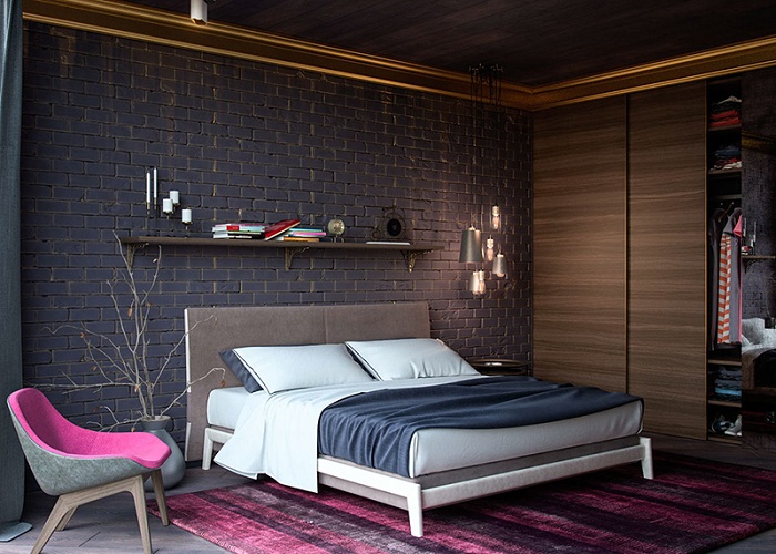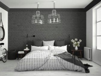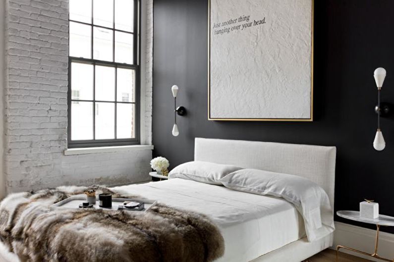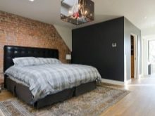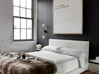 Auch eine Beschichtung aus dunkelgrauen Ziegeln ist eine gute Option. Decke und Boden können jedoch braun sein. Es ist besser, ein Bett in helleren Farben zu wählen: Beige, milchige oder weiße Modelle sind die beste Option. Damit das Design heller und kontrastreicher ausfällt, lohnt es sich, im Schlafzimmer mehrere helle Akzente zu setzen - kleine Sessel in Rot oder Burgund können als solche dienen, ebenso wie ein Teppich mit den gleichen Farben. Diese Option kann funktionieren, wenn der Raum über große Fenster und genügend künstliche Beleuchtung verfügt, damit das Design nicht düster oder zu dunkel wirkt.