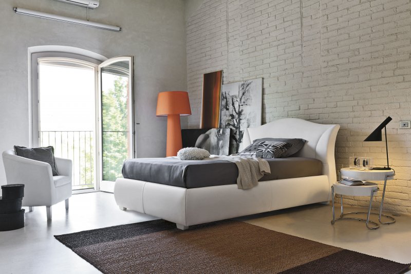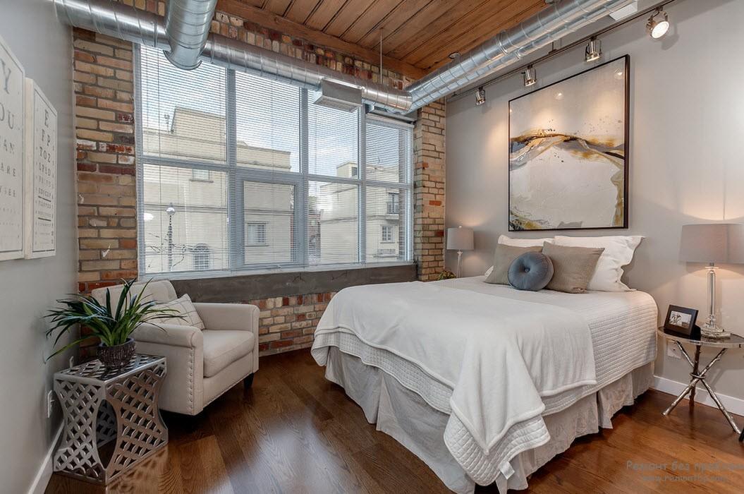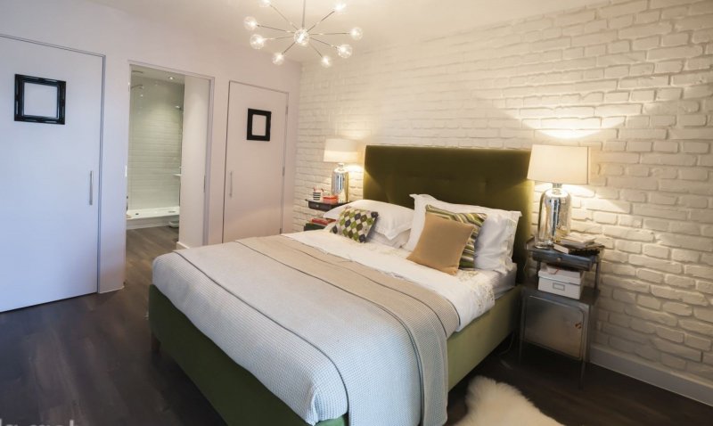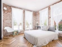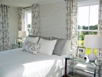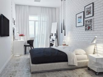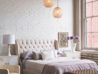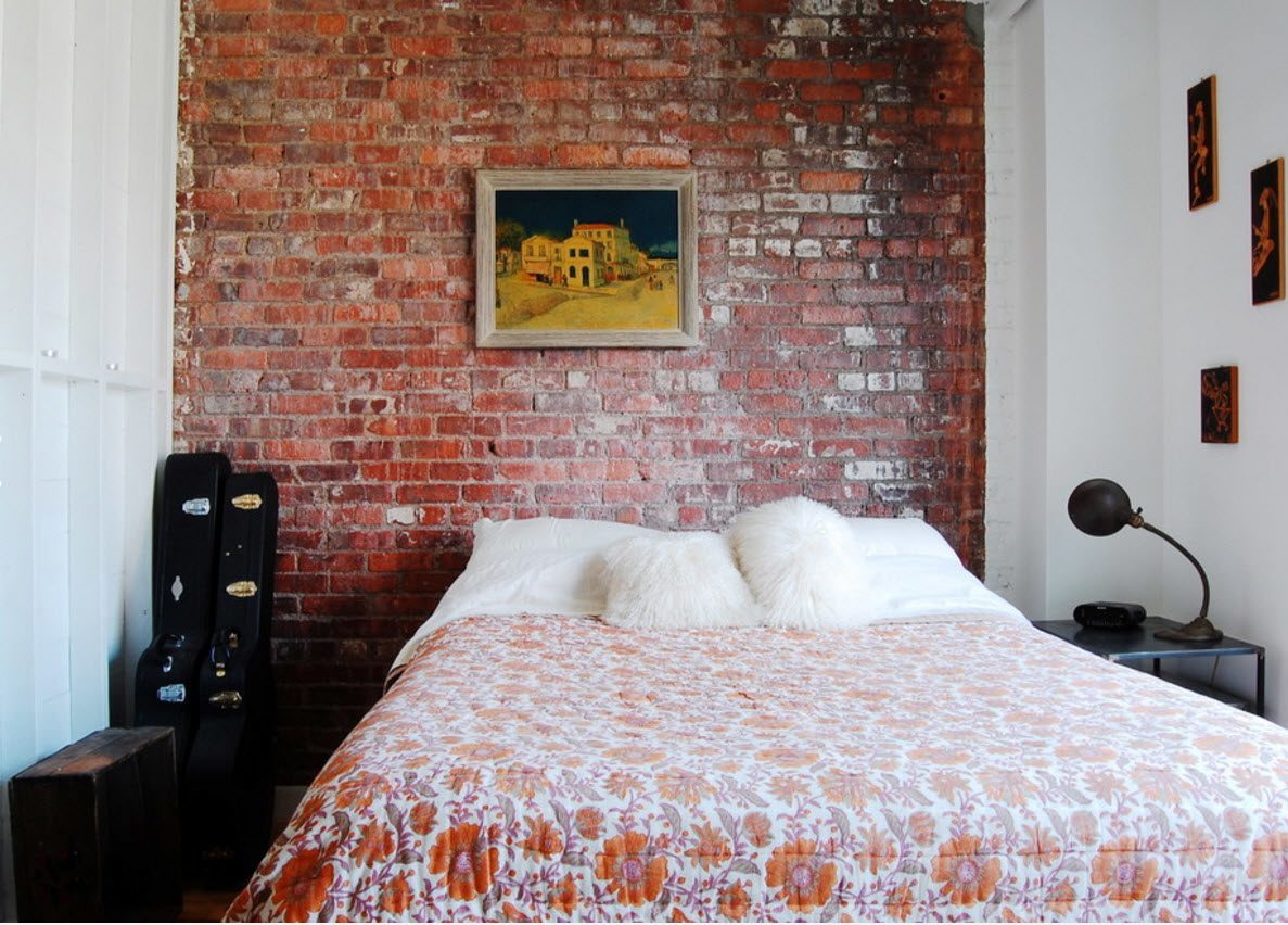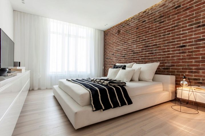 Im Inneren eines Schlafzimmers mit weißen Decken und Böden wird es ungewöhnlich aussehen rote Backsteinmauer... Außerdem ist es besser, dies in der Nähe des Bettes zu tun. Diese Option wird in Räumen mit Panoramafenstern so vorteilhaft wie möglich aussehen. Das Gesamtdesign kann mit dunkleren Textilien, dekorativen Details, einschließlich Gemälden in Holzrahmen, verdünnt werden.