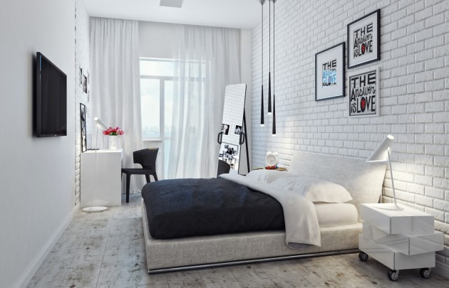 In einem solchen Raum lässt es sich perfekt kombinieren weißes Mauerwerk mit weißen Decken und Bödenaus Naturholz. Gleichzeitig kann das Bett in dunklen Farben hergestellt werden. Um das Design origineller zu gestalten, sollten Sie einige helle dekorative Details hinzufügen. Und auch in diesem Fall passt ein kleiner bunter Teppich perfekt.