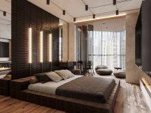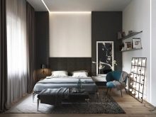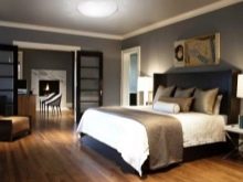 - Luxuriöses Schlafzimmer einer ziemlich großen Fläche mit einem großen Fenster. Hier wurde eine sehr ungewöhnliche Lösung verwendet, indem die Wände in einem dunklen graublauen Farbton gestrichen und ein braunes Laminat verlegt wurden. Doch die hohe natürliche Sonneneinstrahlung lässt den Raum besonders luftig und gemütlich wirken.