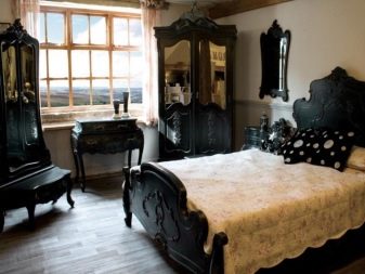 - Jahrgang. Sie müssen ein Bett mit einem durchbrochenen oder geschmiedeten Rücken finden oder bestellen. Verwenden Sie antike Truhen anstelle von Nachttischen. Das Bild wird ohne Spiegel in schönen Rahmen, Bronze- oder Porzellanfiguren, Kandelaber unvollständig sein.