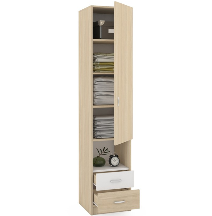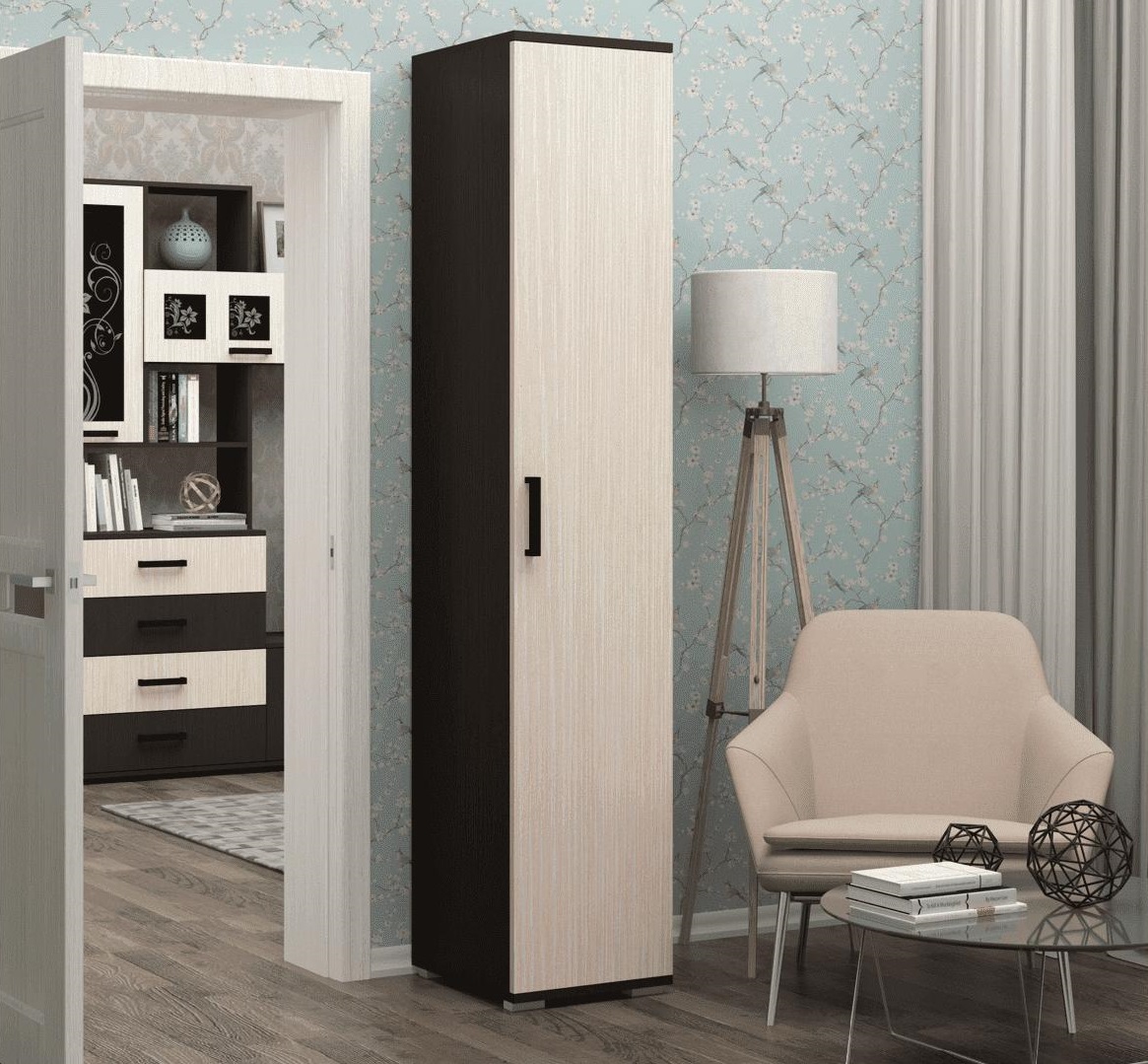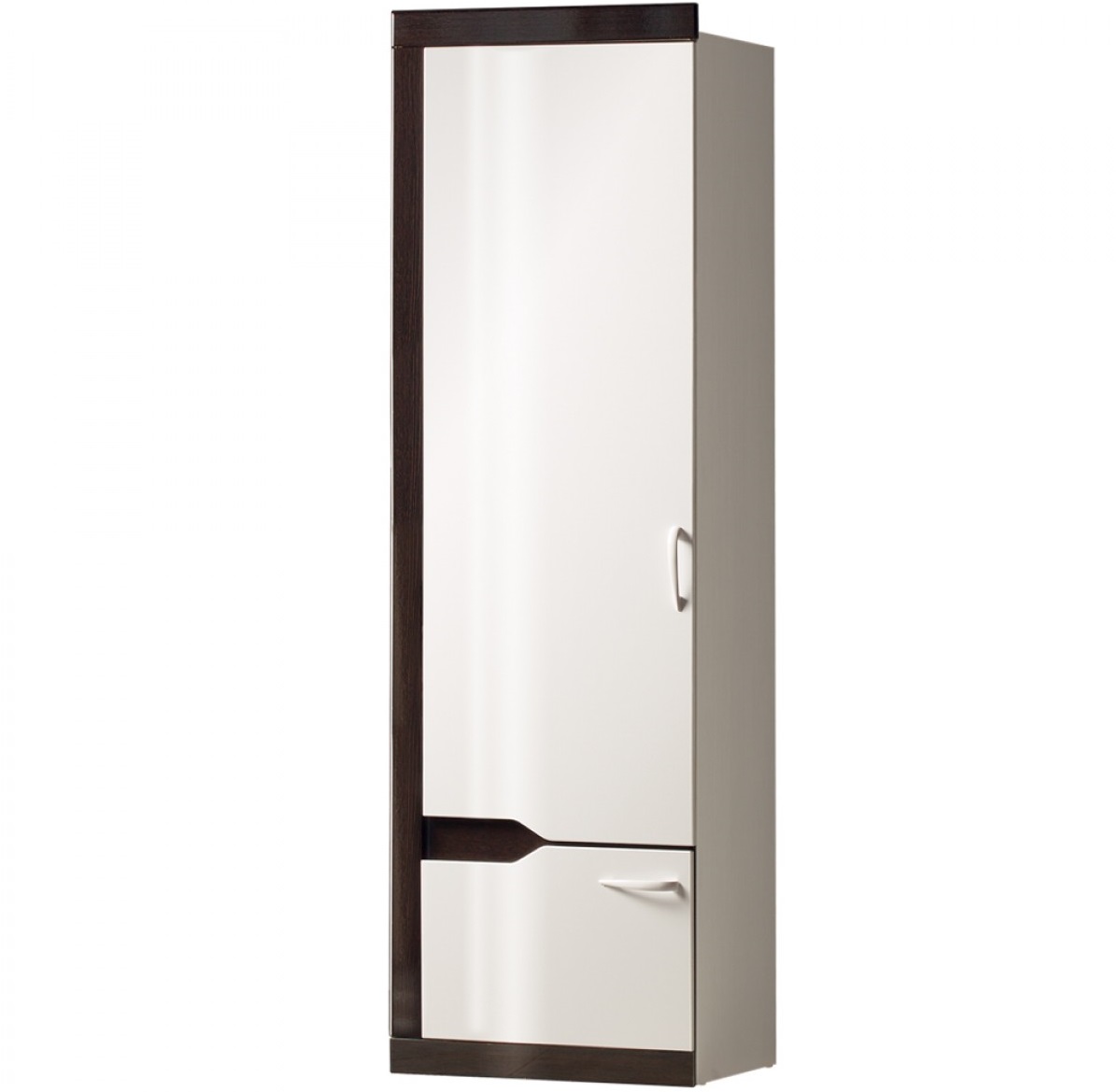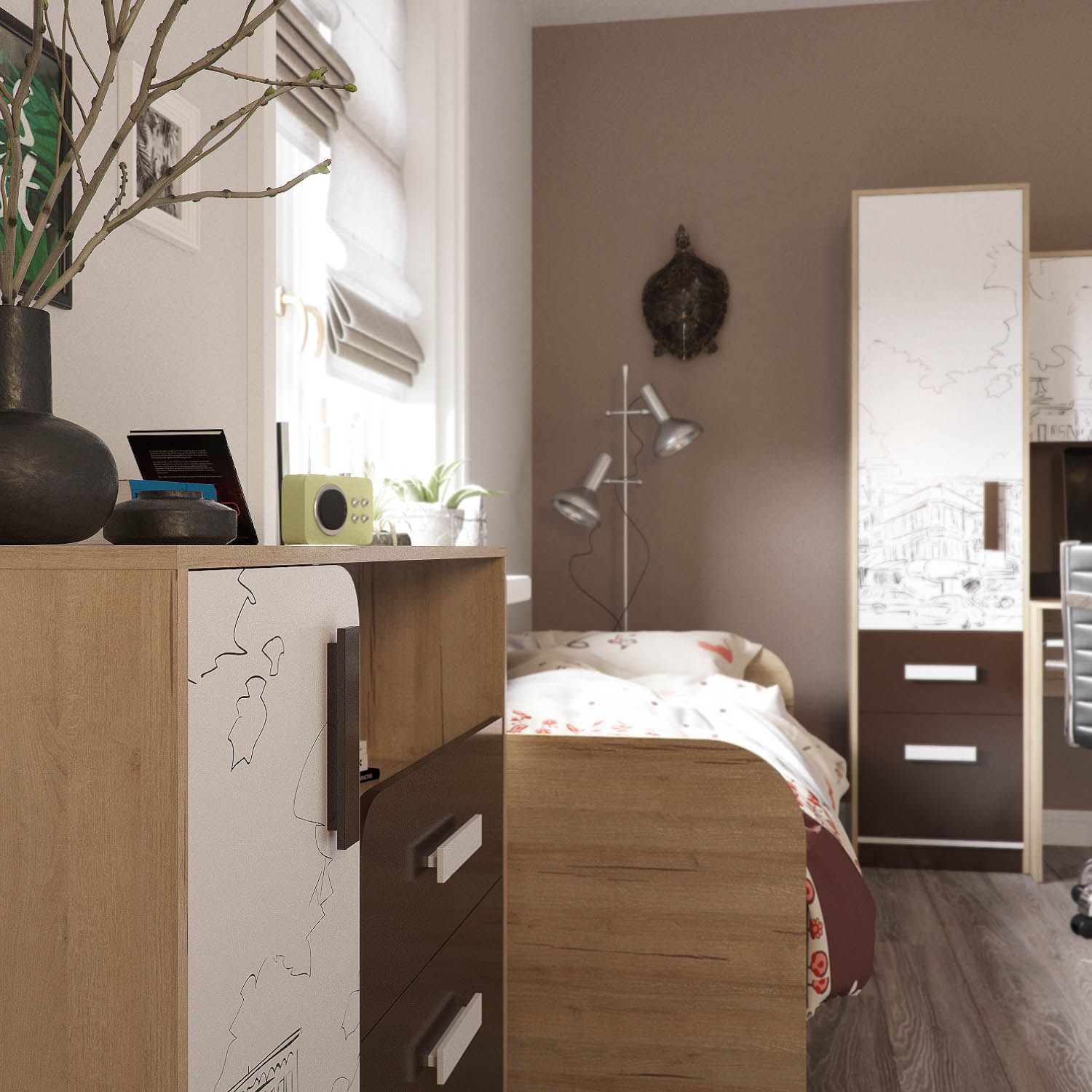 - Das Federmäppchen, dessen Fronten in Weiß- und Brauntönen gehalten sind, findet seinen Platz neben einem Einzelbett aus hellbraunem MDF. Diese Kombination wird harmonisch vor dem Hintergrund von Wänden mit hellbraunem Finish sowie einem hellbraunen Holzboden aussehen.