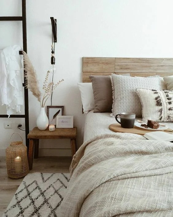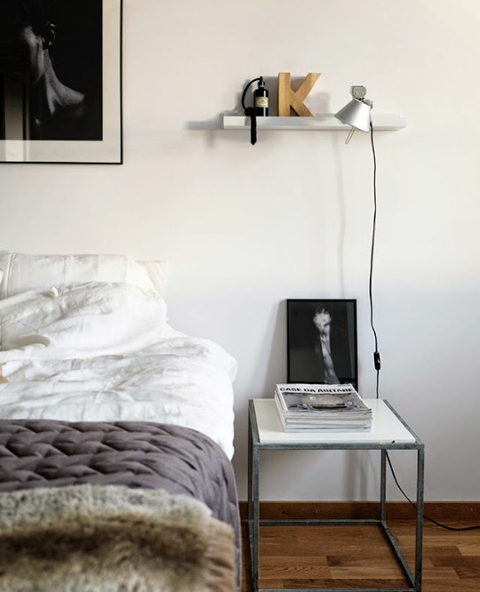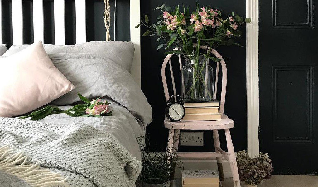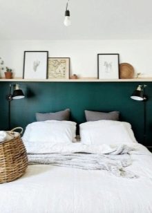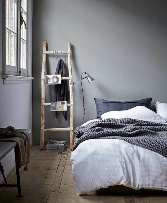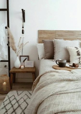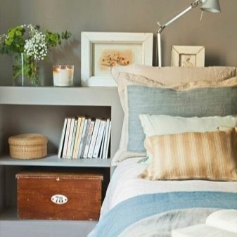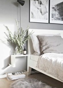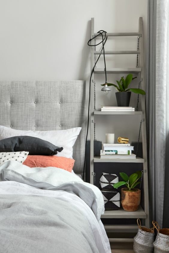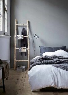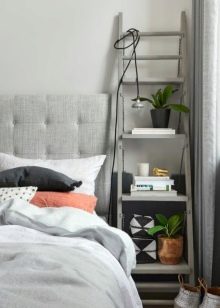 - Eine außergewöhnliche Möglichkeit, den Nachttisch zu ersetzen, ist die Verwendung von kleinen Leitern und Stehleitern. Damit sie mit anderen Möbeln organisch aussehen, müssen sie natürlich in einer passenden Farbe lackiert werden, wenn gewünscht, ergänzt mit einigen Accessoires.